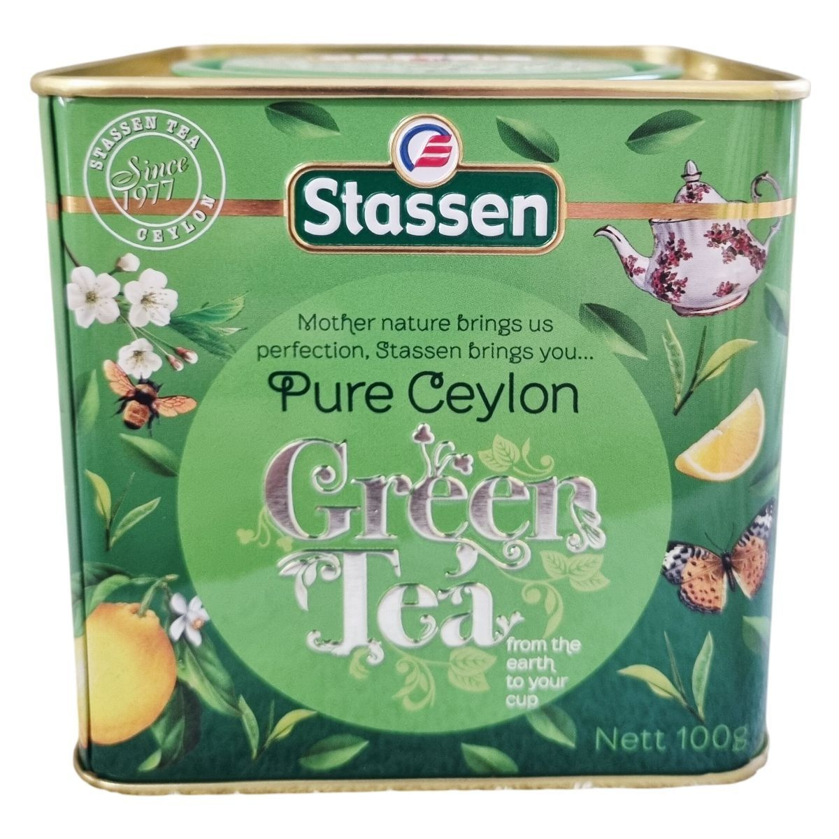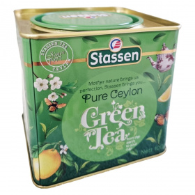 A Stassen Pure Ceylon Green Tea prémium minőségű ceyloni zöld tea, amelyet Srí Lankán termesztenek, szüretelnek és csomagolnak. A dobozon szereplő leírás szerint a tea finom illattal, kellemes ízzel és gazdag természetes antioxidáns- és polifenol-tartalommal rendelkezik. A márka üzenete: „Mother nature brings us perfection, Stassen brings you… Pure Ceylon Green Tea – from the earth to your cup.” A felhasználási útmutató szerint 2–3 perc forrázási idő javasolt. A csomagoláson több nyelvű információ található, köztük a gyártási és exportadatok, valamint a forgalmazói cím is. A fémdobozos kiszerelés aromazáró és tartós megoldást biztosít a teafű számára.