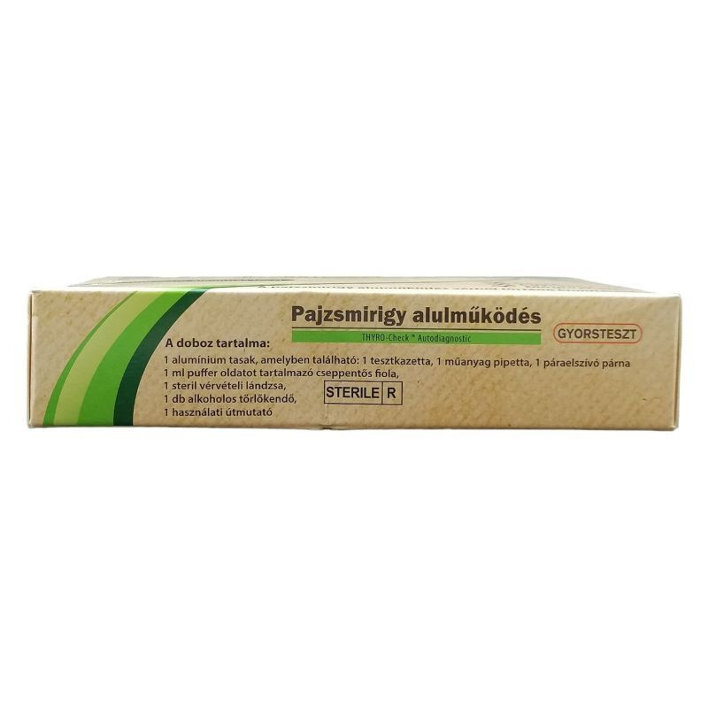 A pajzsmirigy alulműködésnek számtalan fizikai és pszichés tünete lehet. Tesztelje egészségét egyszerűen, gyorsan a Pajzsmirigy alulműködés teszt segítségével! Ne feledje, minél előbb derül fény egy esetleges rendellenességre, a kellemetlen tünetek annál hamarabb megszűntethetőek! Melyek lehetnek a pajzsmirigy alulműködés tünetei? fáradékonyság, levertség, ingerlékenység, súlygyarapodás, étvágycsökkenés, feledékenység, koncentrációs zavar, depresszió, száraz bőr, töredezett haj, ritkuló testszőrzet, kopaszság, fázékonyság, székrekedés, menstruációs zavarok, terméketlenség, strúma (golyva) is kialakulhat, rekedt, mély hang, csökkent libidó, emelkedett koleszterin szint, szem körüli duzzanat, szívritmus zavar, csökkent pulzusszám. Kinek ajánlott elvégezni a Pajzsmirigy alulműködés tesztet? Azoknak, a nőknek, akik a fenti tüneteket tapasztalják, azoknak a férfiaknak, akik merevedési zavarokkal, impotenciával, alacsony libidóval küzdenek, azoknak, akiknek a családjában már fordult elő pajzsmirigy betegség. Mi idézhet elő pajzsmirigy alulműködést a szervezetben? Pajzsmirigy krónikus gyulladása, pajzsmirigy hormontermelésének zavara, elégtelen jódfogyasztás, izotóp-kezelés, pajzsmirigy műtéti eltávolítása. Mit tartalmaz a Pajzsmirigy alulműködés teszt? Pajzsmirigy alulműködés teszt tartozékok. A doboz a teszt elvégzéséhez szükséges eszközöket tartalmazza, mint: 1 db lezárt alumínium tasak, benne: 1 db tesztkazetta, 1 db műanyag pipetta, 1 db páraelszívó