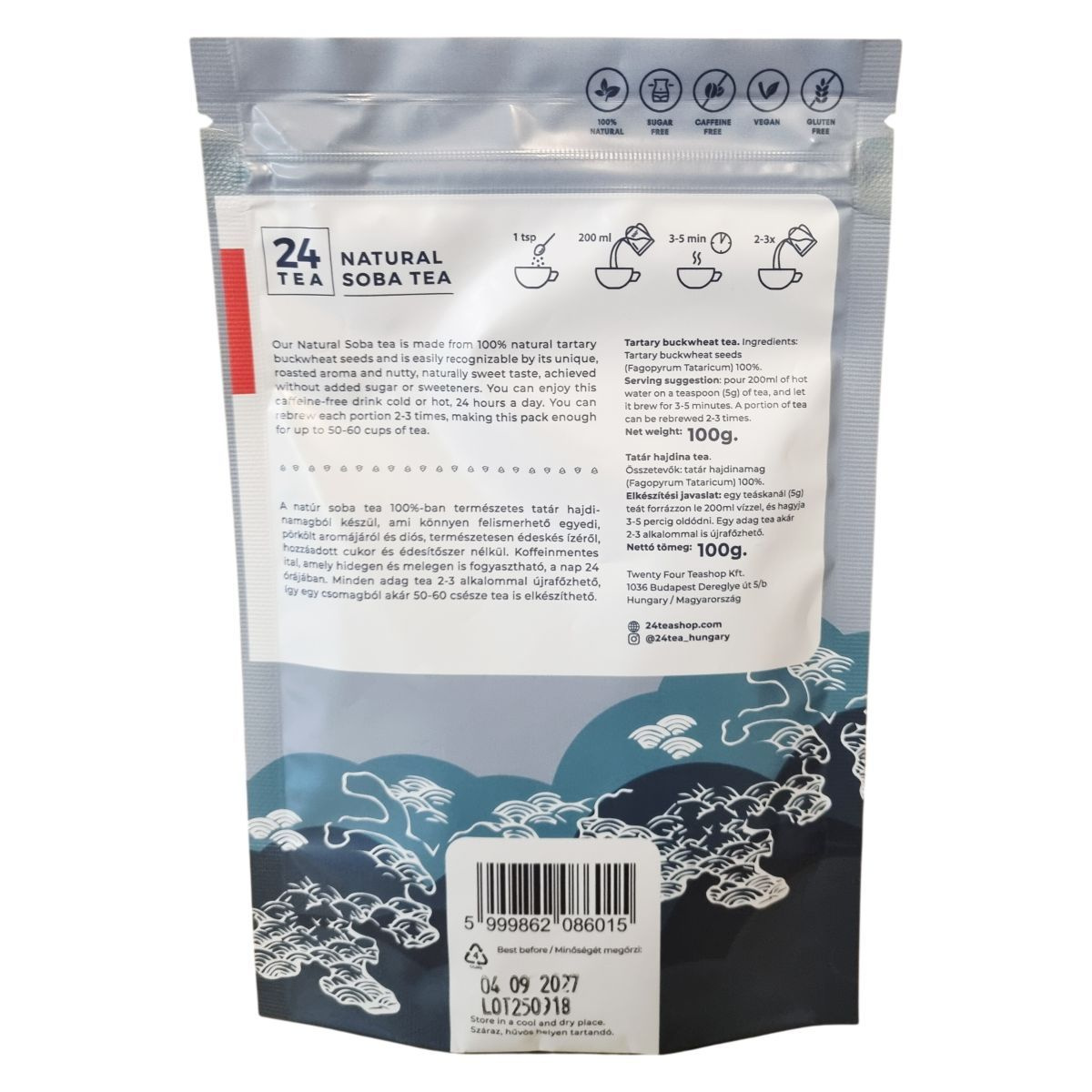 A natúr soba tea 100%-ban természetes tatár hajdina magjából készül, amely egyedi, pörkölt aromájáról és diós, természetesen édeskés ízéről ismert. Ez a koffeinmentes ital bármikor fogyasztható, hidegen vagy melegen is, így a nap bármely szakában élvezhető. Minden adagot 2-3 alkalommal újrafőzhetünk, így egy csomaggal akár 50-60 csésze teát készíthetünk el.