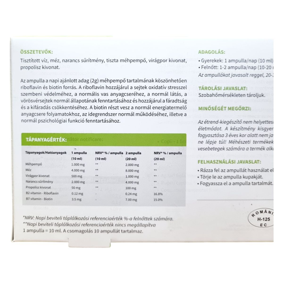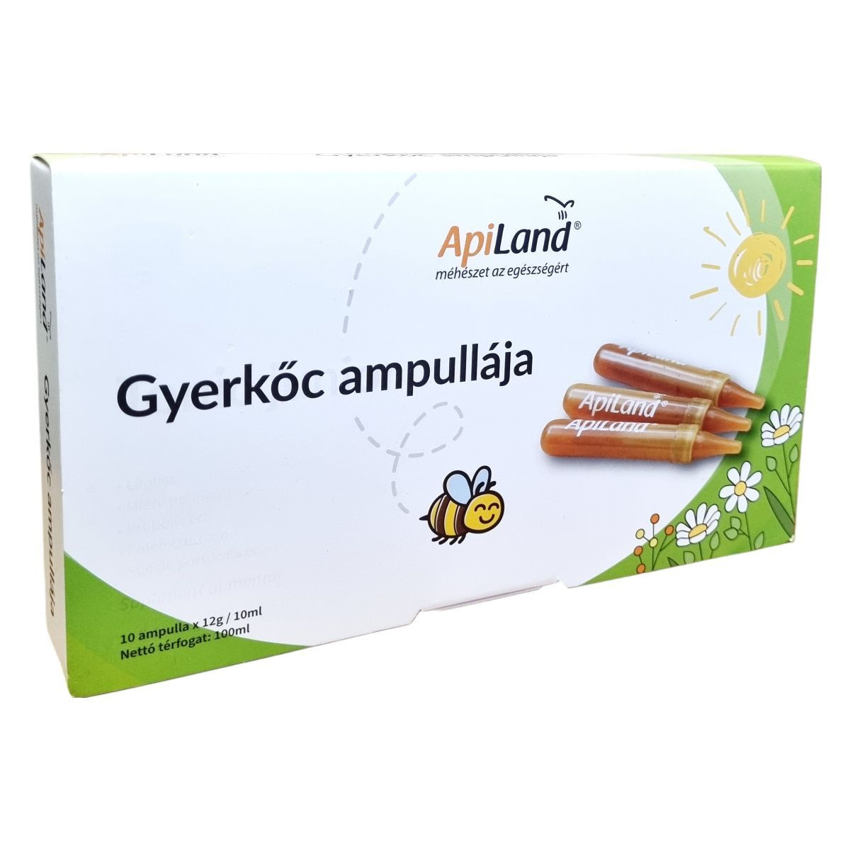 Az ApiLand Gyerkőc ampullája egy különleges étrend-kiegészítő, amely tiszta méhpempőt, mézet, narancs sűrítményt, virágpor és propolisz kivonatot tartalmaz. Az ampullák riboflavin és biotin források, amelyek hozzájárulhatnak a sejtek oxidatív stresszel szembeni védelméhez, a normális vas anyagcseréhez, valamint az idegrendszer normál működéséhez. Az ampullák napi ajánlott adagja gyerekeknek 1 ampulla, felnőtteknek 1-2 ampulla, amelyet reggel, 20-30 perccel evés előtt javasolt fogyasztani. Az étrend-kiegészítő nem helyettesíti a kiegyensúlyozott étrendet, és nem javasolt 3 éves kor alatti gyermekek számára, valamint méhészeti termékekre allergiás személyeknek.