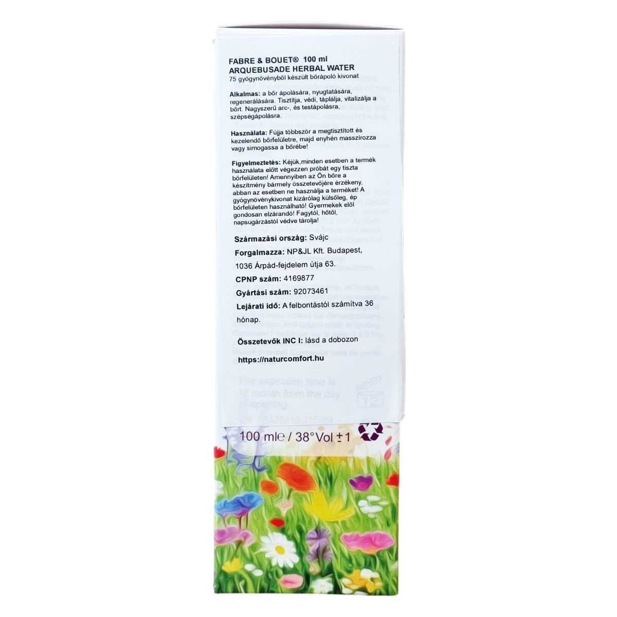 A FABRE & BOUET® ARQUEBUSADE Herbal Water egy Svájcban készült, egyedülálló, 75 gyógynövényből készült bőrápoló kivonat, amely az eredeti 1630-as években írt Arquebusade víz receptúra alapján készült. Ez a gyógynövényes víz erősíti, nyugtatja és regenerálja a bőrt, miközben tisztítja és táplálja azt. Használható arcra és testre is, bőrbarát összetevőinek köszönhetően rendszeres alkalmazása hozzájárul a bőr vitalitásának megőrzéséhez. Minden bőrtípusra alkalmas, de használat előtt érdemes bőrpróbát végezni. A termék történelmi értékkel bír, hiszen az Arquebusade Water autentikus visszaállítása a mai kor igényeihez igazítva, 38° alkoholtartalommal. A termék elősegíti a bőr egészséges állapotának fenntartását, kiválóan alkalmas szépségápolásra és mindennapi bőrápolásra.