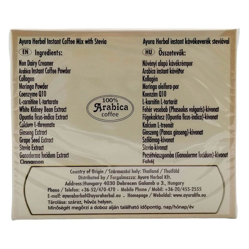 Összetevők: Arabica Instant Kávé, Ganoderma gomba őrlemény, Kollagén, Moringa őrlemény, Kalcium L-treonát, L-Karnitin L-Tartarát, Koenzim Q10, Szőlőmag kivonat, Fehér vesebab, Fahéj