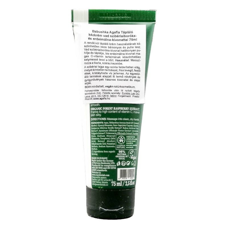 A Szibériai tajga érintetlen területein termő növények és gyógynövényeinek hatóanyával készült. Tápláló kézkrém a bársonyosan puha kezekért. A vad szibériai borókakivonat organikus savakban gazdag ez által hatékonyan puhítja és táplálja a bőrt. Az erdei málnakivonat a magas C - vitamin tartalmának köszönhetően selymessé varázsolja a bőrt
