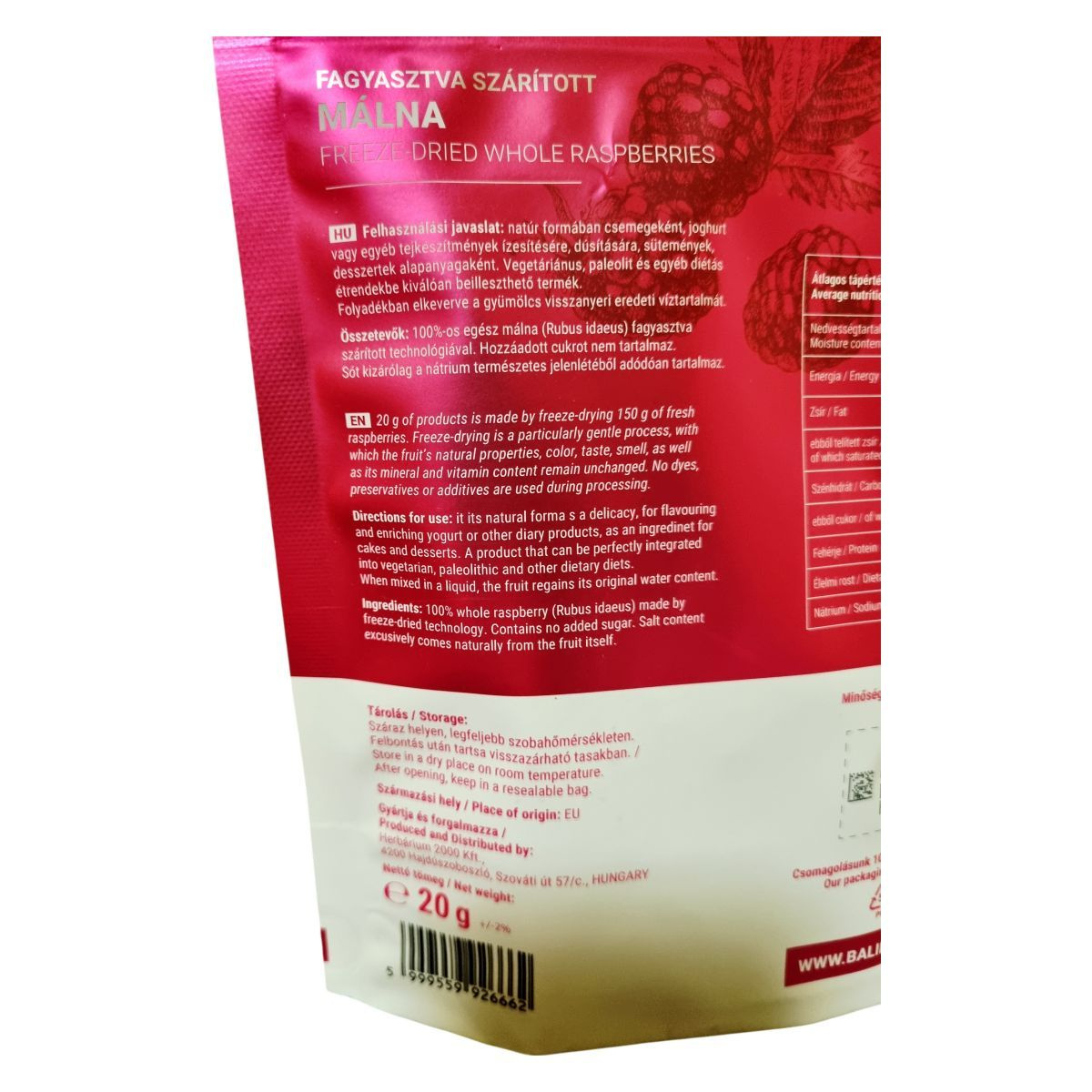 A fagyasztva szárított málna kíméletes eljárással készült termék, amely megőrzi a gyümölcs természetes tulajdonságait, így íz, aroma, szín, ásványi anyag- és vitamintartalom változatlan marad.