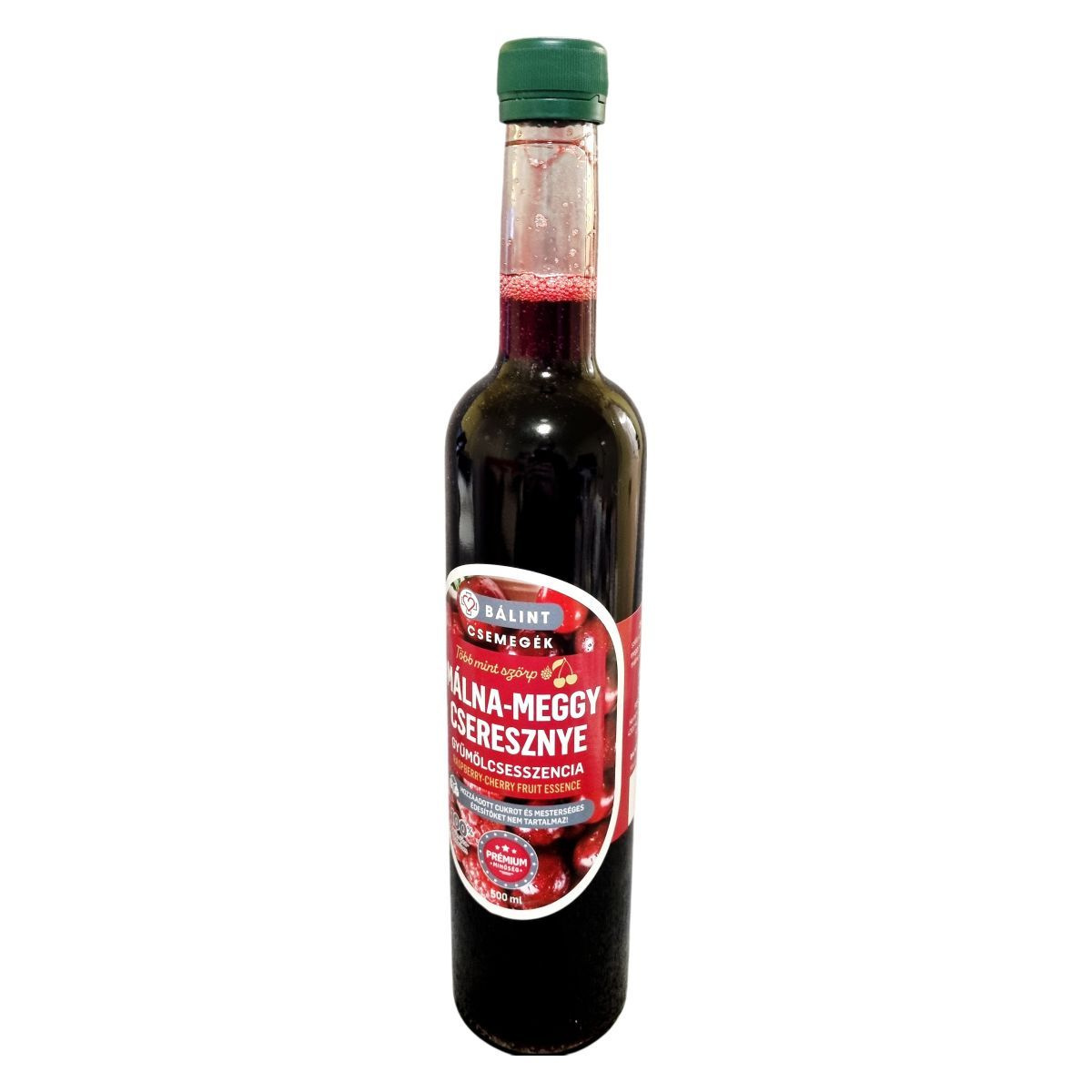 A málna–meggy–cseresznye gyümölcsesszencia szőlő, meggy, málna és cseresznye sűrítmény felhasználásával készül. Cseppmentes kiöntővel ellátott, környezetbarát csomagolású prémium termék, amely kizárólag az alapanyagok természetes nátriumtartalma miatt tartalmaz sót.