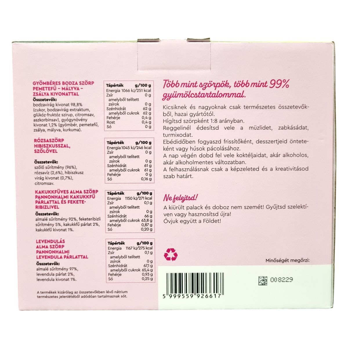 A válogatás négyféle ízvilágot kínál: gyömbéres bodza gyógynövényekkel, rózsaszörp hibiszkusszal és szőlővel, kakukkfüves alma feketeribizlivel, valamint levendulás alma. A termékek több mint 99% gyümölcstartalommal készülnek, és kizárólag az összetevők természetes nátriumtartalmából adódóan tartalmaznak sót.