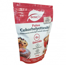 A benefitt Paleo Cukorhelyettesítő diétás és diabetikus étrendet követők számára készült, négyszeres édesítőerejű asztali édesítőszer, amely eritrit és stevia megfelelő arányú kombinációján alapul. A hagyományos kristálycukornál négyszer édesebb, így megkönnyíti az édesítés élvezetét bűntudat és kockázat nélkül. Kalóriamentes termék, amely ideális reggeli kávé, italok vagy desszertek ízesítésére. Gyártása során figyelnek az allergénekre, mentes gluténtől, szójától, tojástól, tejtől és tejszármazékoktól. Fontos azonban a fogyasztás mennyiségének betartása és a használati útmutató követése a legjobb eredmény és biztonság érdekében.
