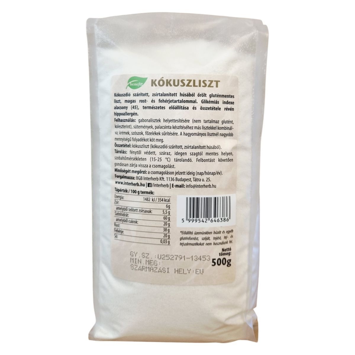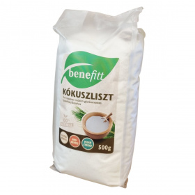 A benefitt kókuszliszt kizárólag kókuszdió szárított, zsírtalanított húsából készül, ezért gluténmentes és hipoallergén. Alacsony glikémiás indexű (45), így alkalmas különféle étrendi igényekre. Előállítása természetes, és nem tartalmaz glutént, koleszterint, szóját, tojást, valamint tej- és tejszármazékokat. Üzemükben nem használják fel az említett allergéneket és gluténforrásokat. A nettó tömege 500 gramm, és az Európai Unió területéről származik.