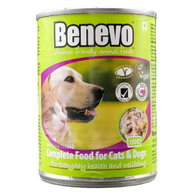 A Benevo Duo egy ízletes és könnyen emészthető, kisállat dietetikai szakértők által kidolgozott vegán eledel, mely mentes az állati eredetű összetevőktől, mesterséges ízfokozóktól vagy színezékektől. Nem tartalmaz húst, halat, szóját, búzát és tejtermékeket, melyek a leggyakoribb allergének. Vegán taurint tartalmaz, ami előnyös a kutyáknak, és nélkülözhetetlen a macskák számára. Összetétel: édesburgonya, a feldolgozáshoz szükséges mennyiségű víz, répa, zabdara, növényi olaj, barna rizs, borsó, paradicsom, kék áfonya, vörös áfonya, sörélesztő, szárított tengeri moszat, természetes aromák. Adalékok: Vitaminok: E, B3, C, B1, B5, A, folsav (B9), B2, B7, B6, B12, D3, ásványi anyagok (cink-szulfát, vas-szulfát, cink-proteinát, réz-szulfát, mangán-szulfát, réz-proteinát, nátrium-szelenit, mangán-proteinát, kálium-jodid), Provitaminok: taurin: 1250 mg/kg. Analitikai összetétel: nyersfehérje: 7%, nyersolajok és -zsírok: 2%, nyersrost: 3%, nyershamu: 2%, nedvesség: 76%.