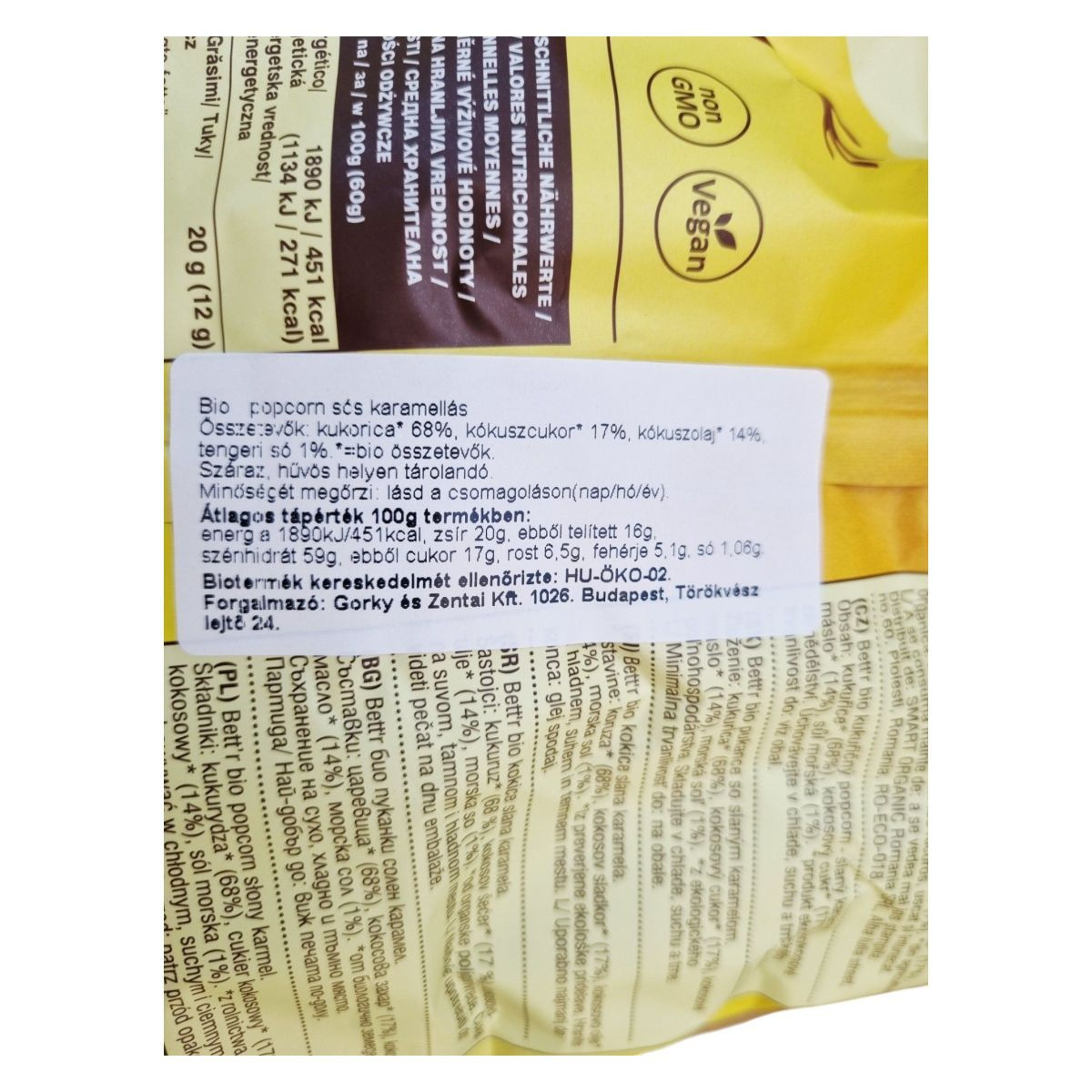 A bett'r sós karamellás popcornja egy ízletes, bio és vegán snack, amely kókuszolajjal készül. A termék nem tartalmaz GMO-összetevőket, így bűntudat nélkül élvezheted a sós és édes ízek tökéletes harmóniáját. A popcorn 68% kukoricából, 17% kókuszcukorból és 14% kókuszolajból készül, mind bio minősítésű összetevőkből. Az energia- és tápérték adatok alapján a termék gazdag rostokban és alacsony cukortartalmú, így ideális választás lehet egészségtudatos fogyasztók számára. A popcorn forgalmazója a Gorky és Zentai Kft., és a termék biotermék kereskedelmét a HU-ÖKO-02 tanúsítvány igazolja.