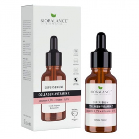 Szuperszérum arcra tengeri kollagénnel és C-vitaminnal. 4,5% Tengeri kollagén + 0,5% C-vitamin. Vízbázisú szérum. Feszesítő, ragyogást fokozó, antioxidáns hatású. Dermatológiailag tesztelt.