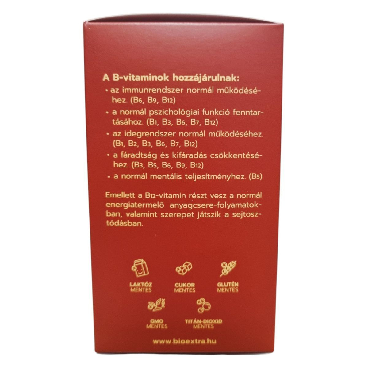 A BIOEXTRA B-KOMPLEX PLUSZ egy átfogó B-vitamin komplex, amely segíthet támogatni az idegrendszer és az immunrendszer normál működését. A termék B1, B2, B3, B5, B6, B7, B9 és B12 vitaminokat tartalmaz, amelyek hozzájárulhatnak a fáradtság csökkentéséhez és a normál pszichológiai funkciók fenntartásához. A termék GMO-mentes, gluténmentes, laktózmentes és titán-dioxid mentes, így különböző étrendi igényekhez is alkalmazkodik. A kapszulák könnyen lenyelhetők, és napi egy kapszula bevétele javasolt.