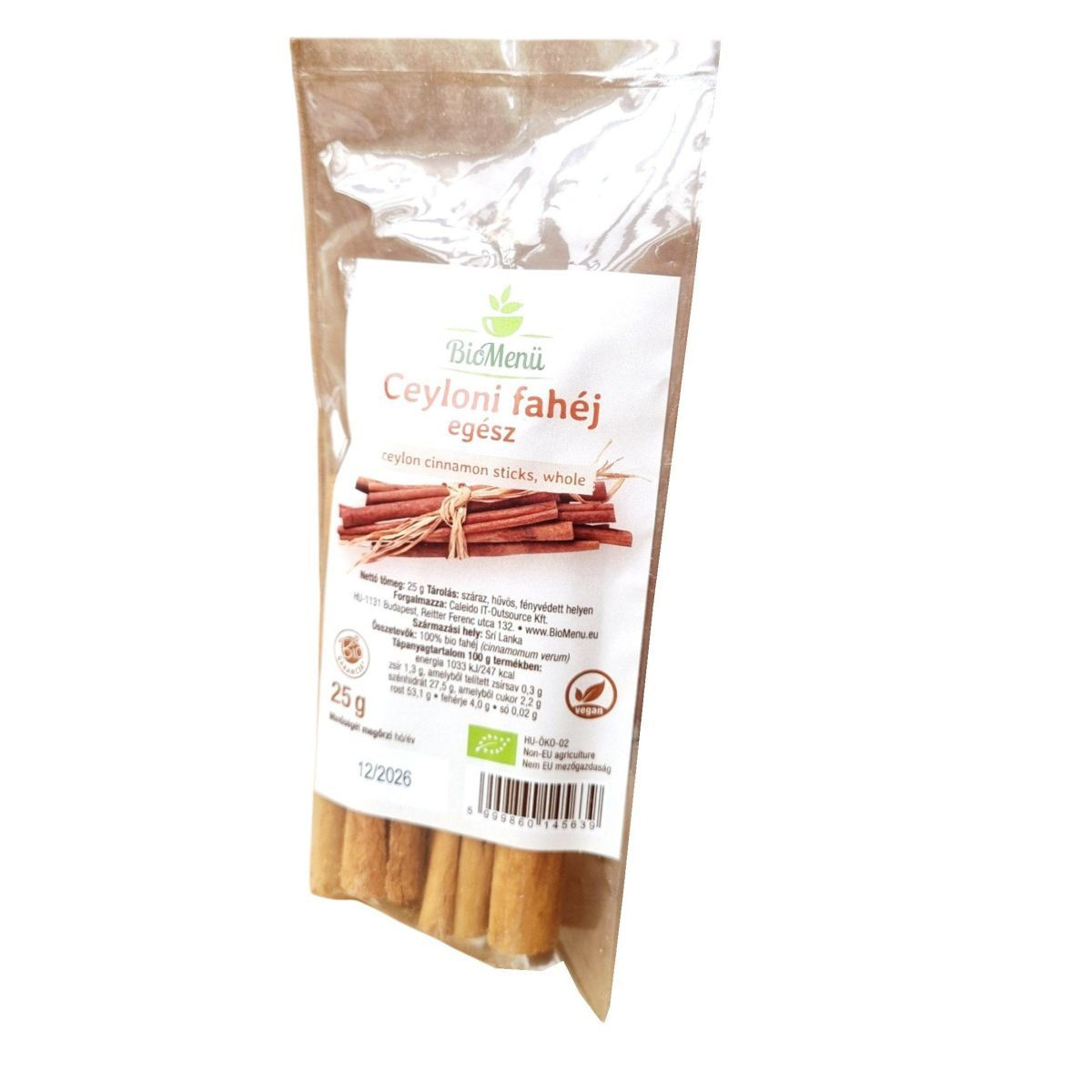 A BioMenü Ceyloni fahéj egy prémium minőségű, egész fahéj termék, amely 100% bio összetevőkből áll. A termék Sri Lankáról származik, és a Caleido IT-Outsource Kft. forgalmazza Magyarországon. A fahéj gazdag rosttartalmú, alacsony zsírtartalommal rendelkezik, és ideális választás lehet a vegán étrendet követők számára. A termék HU-ÖKO-02 tanúsítvánnyal rendelkezik, amely biztosítja a bio minőséget. Tárolása száraz, hűvös és fényvédett helyen ajánlott.