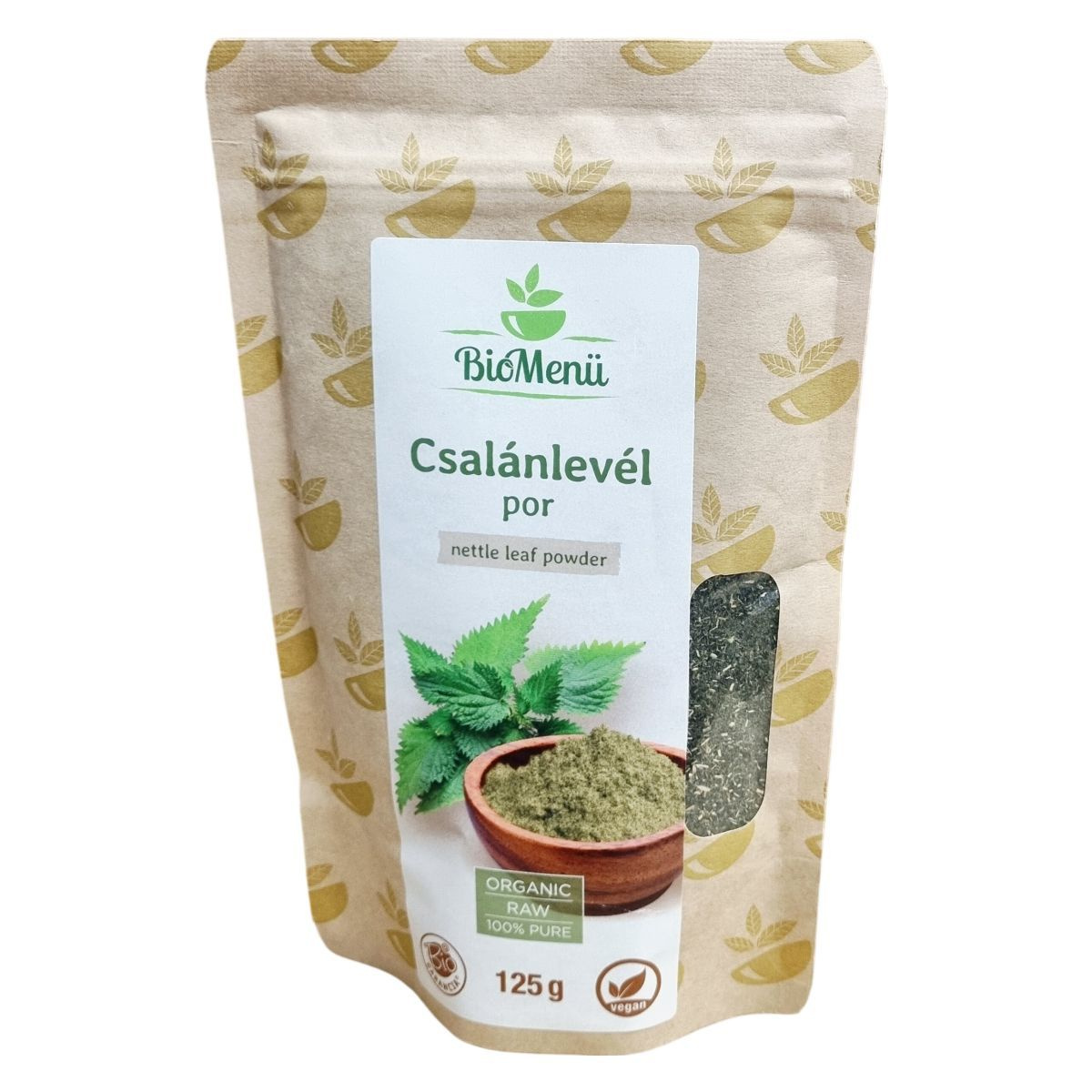 A BioMenü bio csalánlevél por természetes termék, amely származási helye az Európai Unió. A termék por alakban kínálja a csalánlevelet, amely többféleképpen felhasználható: például pörkölteként, levesbe főzve, kenőcsként alkalmazva, illetve gyógyteaként vagy étrend-kiegészítőként fogyasztható. Az összetevő tisztán bio csalánlevél (urtica dioica). Mivel természetes alapanyagból készül, táplálkozási tulajdonságai a környezeti feltételektől és az idő múlásától függően változhatnak.