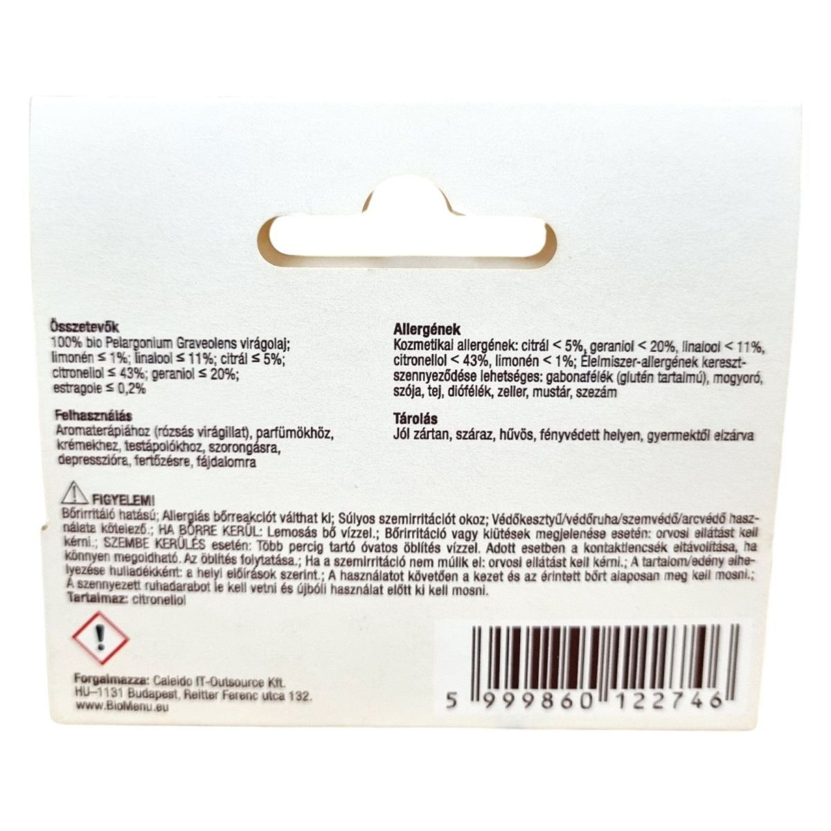 A BioMenü 100% BIO Pelargonium Graveolens virágolaj egy kiváló minőségű, egyiptomi eredetű geranium illóolaj, amely rózsás-mentolos illatával és világossárga-mélysárga-sárgászöld színével tűnik ki. A termék cseppentős pipettás kupakkal van ellátva, ami takarékos és pontos adagolást tesz lehetővé. Az olaj adalékmentes, 100%-ban természetes alapanyagokból készült, és széles körben alkalmazható aromaterápiában, parfümökben, krémekben és testápolókban. Emellett hatékony lehet szorongás, depresszió, fertőzések és fájdalom kezelésére is. Fontos azonban figyelni a használat során, mivel bőrirritációt és allergiás reakciókat okozhat, ezért védőfelszerelés használata ajánlott.