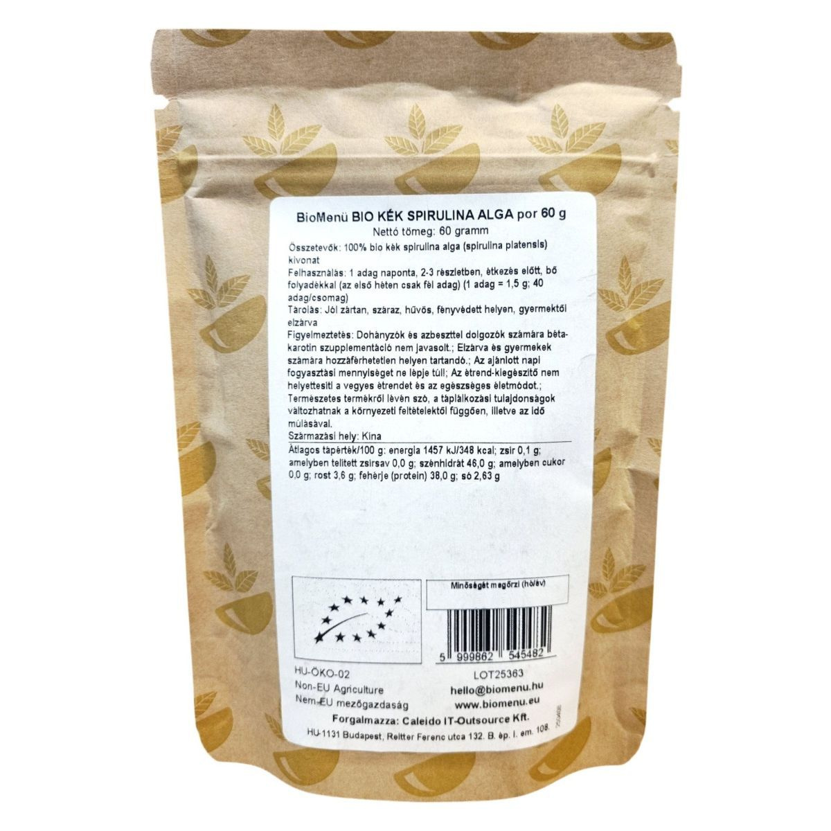 A BioMenü Kék Spirulina algapor egy 100% bio spirulina platensis kivonatot tartalmazó étrend-kiegészítő, amely Kínából származik. A termék bio, raw és vegán étrendi irányzatoknak megfelelően készült, és 60 grammos kiszerelésben kapható. Az algapor fogyasztása napi egy adagban, 2-3 részletben, étkezés előtt, bő folyadékkal ajánlott. Az első héten csak fél adag fogyasztása javasolt. A termék táplálkozási tulajdonságai változhatnak a környezeti feltételektől függően. Fontos, hogy az ajánlott napi fogyasztási mennyiséget ne lépje túl, és az étrend-kiegészítő nem helyettesíti a vegyes étrendet és az egészséges életmódot. A termék HU-ÖKO-02 tanúsítvánnyal rendelkezik, és a Caleido IT-Outsource Kft. forgalmazza.