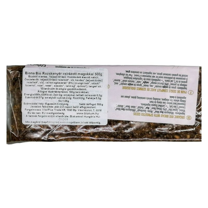 Összetevők: teljes kiőrlésű rozsliszt, víz, kovásszal, csírázott magvak (chia mag, lenmag), só.