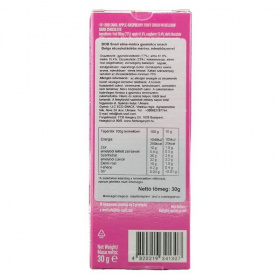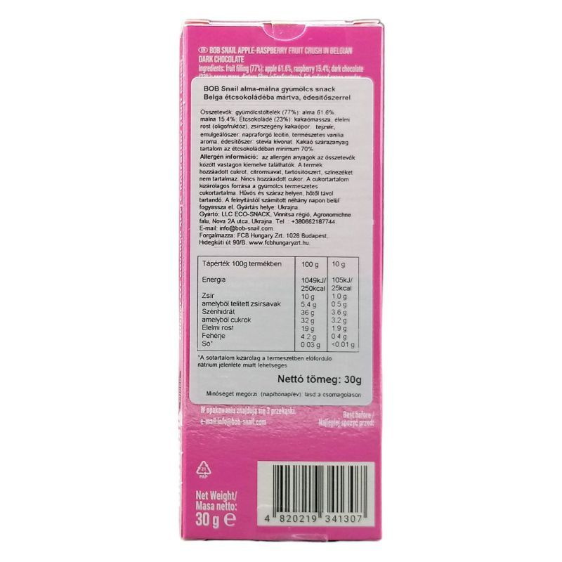 Alma, málna, Kakaómassza, élelmi rost, kakaóvaj, zsírszegény kakaópor, tejzsír, szójalecitin, természetes vanília aroma,stevia kivonat.