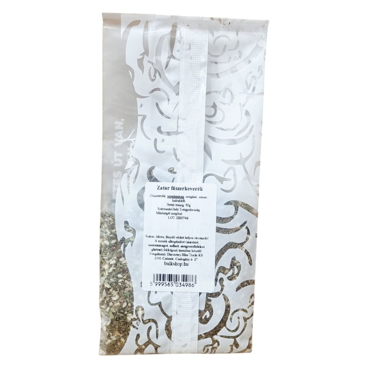 A BULK.SHOP Zatar fűszerkeveréke egy magyar vállalkozás által forgalmazott natúr termék, amely Lengyelországban készül. A csomagolás nettó tömege 50 gramm. A fűszerkeverék különféle növényi összetevőket tartalmaz, köztük szezámmagot, oregánót, sumacot és kakukkfüvet. Figyelembe kell venni, hogy a gyártóüzem allergéneket is feldolgozhat, így a termékhez kapcsolódó allergén információk fontosak a fogyasztók számára.