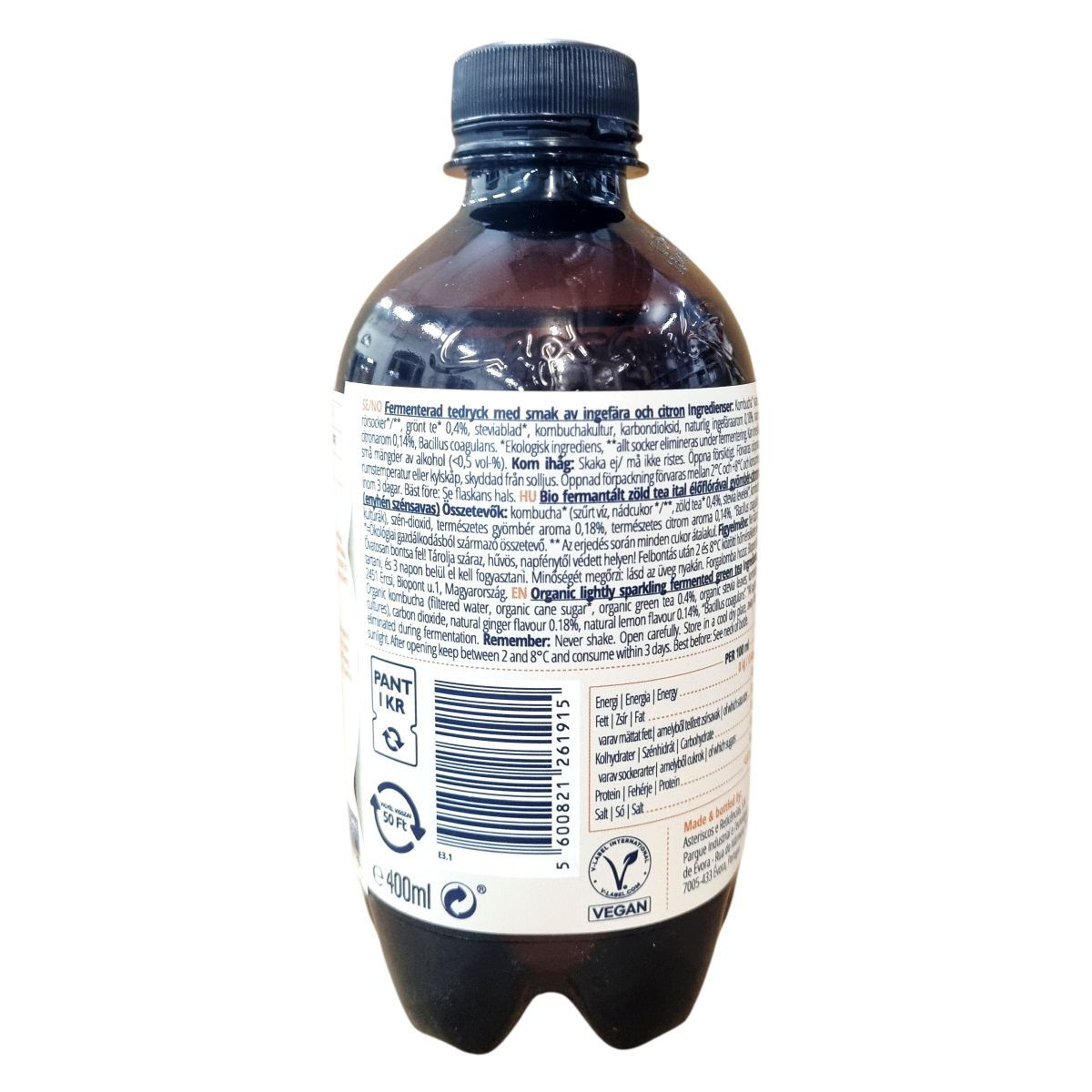 kombucha (szűrt víz, nádcukor*, zöld tea* 0,4%, stevia levél*, kombucha kultúrák), szén-dioxid, természetes gyömbér aroma 0,18%, természetes citrom aroma 0,14%, Bacillus coagulans