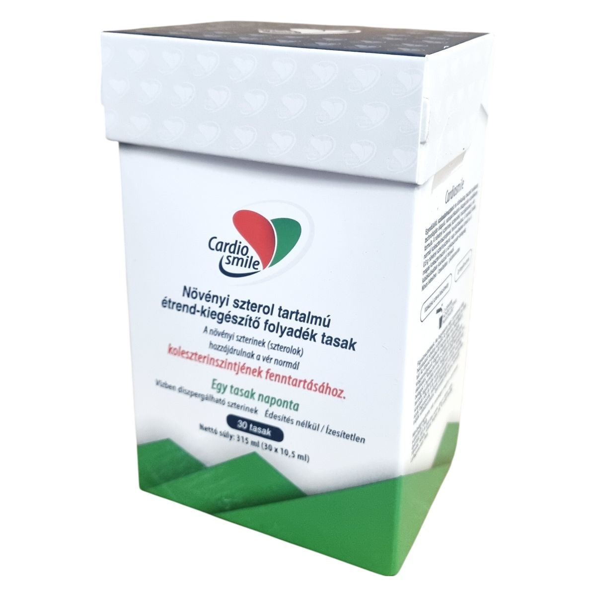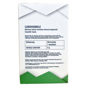 A Cardiosmile egy szabadalmaztatott, klinikailag tesztelt, nanopartikuláris diszperziós technológián alapuló vízoldékony formula, amely vízbázisú növényi szterol készítményt tartalmaz. A termék 2 gramm növényi szterolt biztosít tasakonként, amely hozzájárulhat a normál vérkoleszterinszint fenntartásához. A magas koleszterinszint rizikófaktora lehet a szívkoszorúér-betegség kialakulásának, ezért a termék fogyasztása támogathatja a koleszterinszint szabályozását. A termék édesítés és ízesítés nélkül készült, így bármilyen hideg vagy meleg italhoz vagy ételhez adható. Használat előtt a tasak felrázandó, majd közvetlenül elfogyasztható vagy az ételbe keverhető. A termék kizárólag azok számára ajánlott, akiknek szükségük van ilyen étrend-kiegészítőre, és nem pótolja a kiegyensúlyozott étrendet vagy az egészséges életmódot.