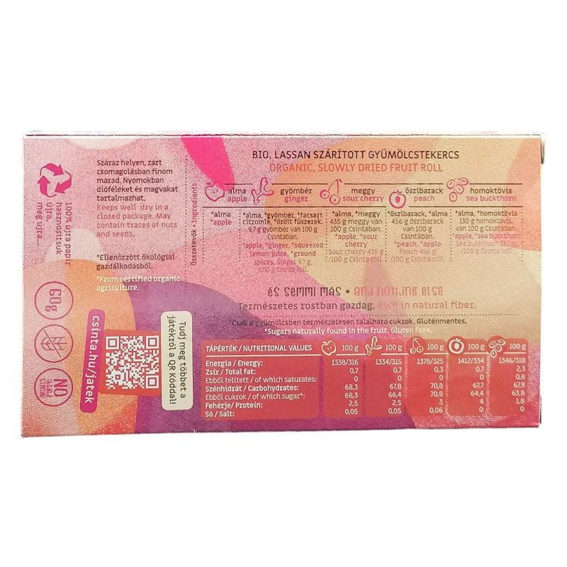 Bio Szárított gyömbéres gyümölcstekercs. Összetevők: alma, gyömbér, fűszerek és semmi más. Száraz hűvös helyen, zárt csomagolásban tartva finom marad.