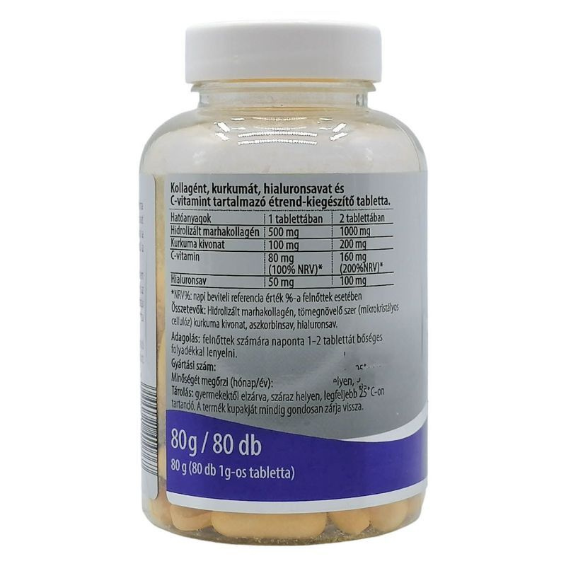 Összetétel: Hidrolizált marhakollagén, tömegnövelő szer (mikrokristályos cellulóz), kurkuma kivonat, aszkorbinsav, hialuronsav.