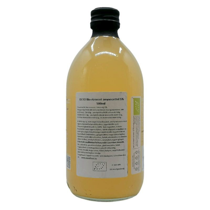 Az ecet egészséges tulajdonságai miatt ideális összetevőként használható öntetekhez, salátákhoz, gyógyteákhoz vagy vízben hígítva. A rizsecetet ezen felül húsos alapú ételek ízesítéséhez használják. Az erjesztés során keletkező “anyának" köszönhető a bio, szűretlen rizsecet egészségre gyakorolt élettani hatása. Segíti az egészséges emésztést, fertőtlenítő hatású, jó hatással van a májra, segít a kimerültség ellen, erősíti az immunrendszert, segít megőrizni a szív egészségét, támogatja az ideális testsúly elérését, ragyogóvá teszi a bőrt, természetes arctonik. A DETO elnyerte a Gulfood Innovation Awards 2020. fődíját Dubajban a "Leginnovatívabb egészséges és wellness termék" kategóriában. Tárolás: Kérjük, hogy száraz, hűvös helyen, majd felbontás után hűtőszekrényben tárolja. Összetevők: bio rizsecet. Savasság 5%.
