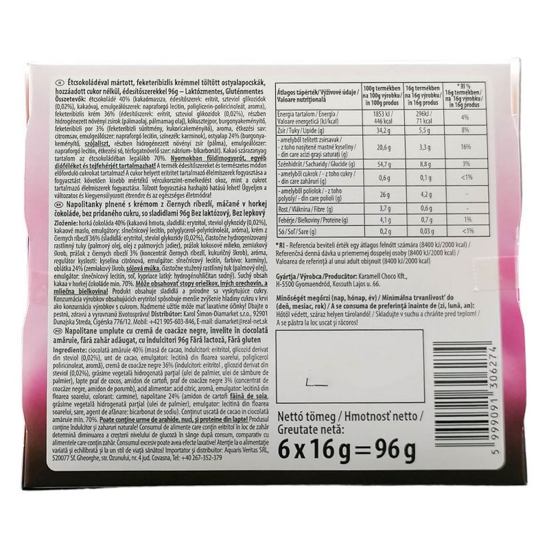 Összetevők: ostyalap (búzaliszt, víz, só), feketeribizli krém (feketeribizli, édesítőszer, stabilizátor), étcsokoládé (kakaóvaj, kakaópor, édesítőszer).