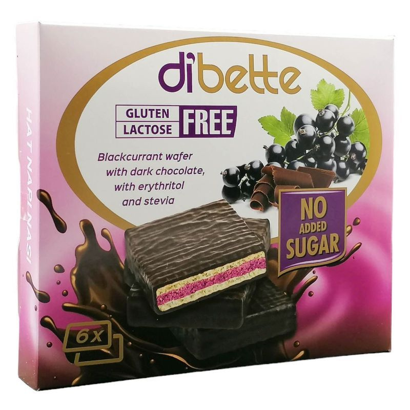 Diabette NAS LAKTÓZMENTES ribizlis krémmel töltött OSTYALAPOCSKÁK étcsokoládéval mártva ostya édesítőszerrel, erittel 96g.