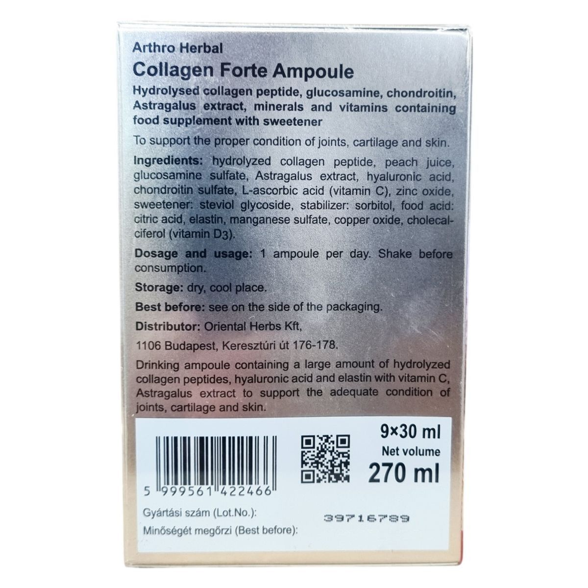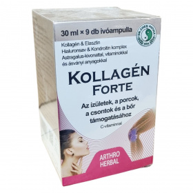 Az Arthro Herbal Kollagén Forte ivóampulla olyan étrend-kiegészítő, amely hidrolizált kollagénpeptideket, glükózamint, kondroitint, Astragalus-kivonatot, valamint vitaminokat és ásványi anyagokat tartalmaz. Kiemelt mennyiségű hialuronsavat és elasztint is tartalmaz, melyek hozzájárulhatnak az ízületek, porcok és bőr megfelelő állapotának támogatásához. Az Astragalus (csüdfügyökér) segítheti az ízületek mozgékonyságát és rugalmasságát. A C-vitamin hozzájárulhat a normál kollagénképződéshez, ezzel támogatva a porcok, csontozat és bőr normál működését. A D-vitamin, cink és mangán hozzájárulhatnak a csontozat egészségének megőrzéséhez, míg a cink és mangán a bőr normál állapotának fenntartásában játszhat szerepet. A C- és D-vitamin az immunrendszer működését is támogathatja. Az ivóampullák édesítőszerrel készülnek, és a használat előtt fel kell rázni őket. A termék a minőségi előírások szerint, helyes gyógyszergyártási gyakorlat betartásával készül, hosszú évek óta megbízható a fogyasztók körében.