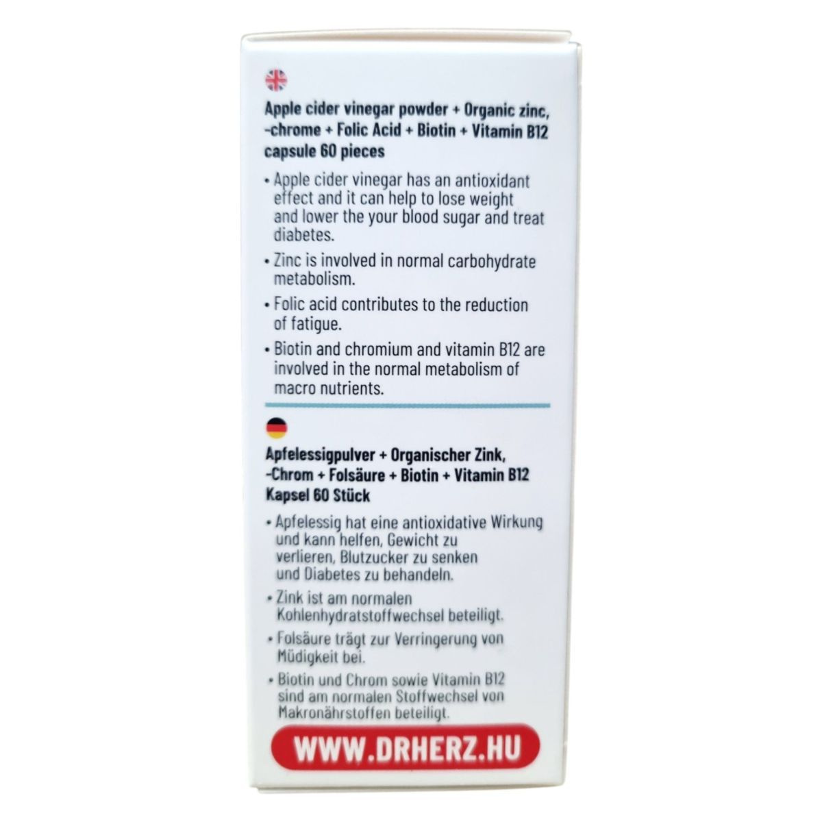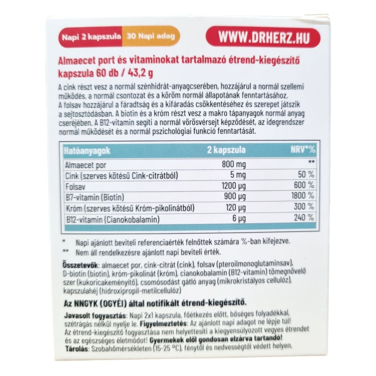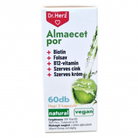 A Dr. Herz Almaecet por kapszula egy komplex étrend-kiegészítő, amely almaecet port, biotint, folsavat, B12-vitamint, szerves cinket és krómot tartalmaz. Az almaecet antioxidáns hatású lehet, és hozzájárulhat a testsúlycsökkentéshez, valamint a vércukorszint szabályozásához. A cink és a króm részt vehet a normál szénhidrát-anyagcserében, míg a folsav segíthet a fáradtság csökkentésében. A biotin és a B12-vitamin támogathatja a makro tápanyagok normál anyagcseréjét és az idegrendszer normál működését. A termék bio és vegán étrendi irányzatoknak is megfelel.