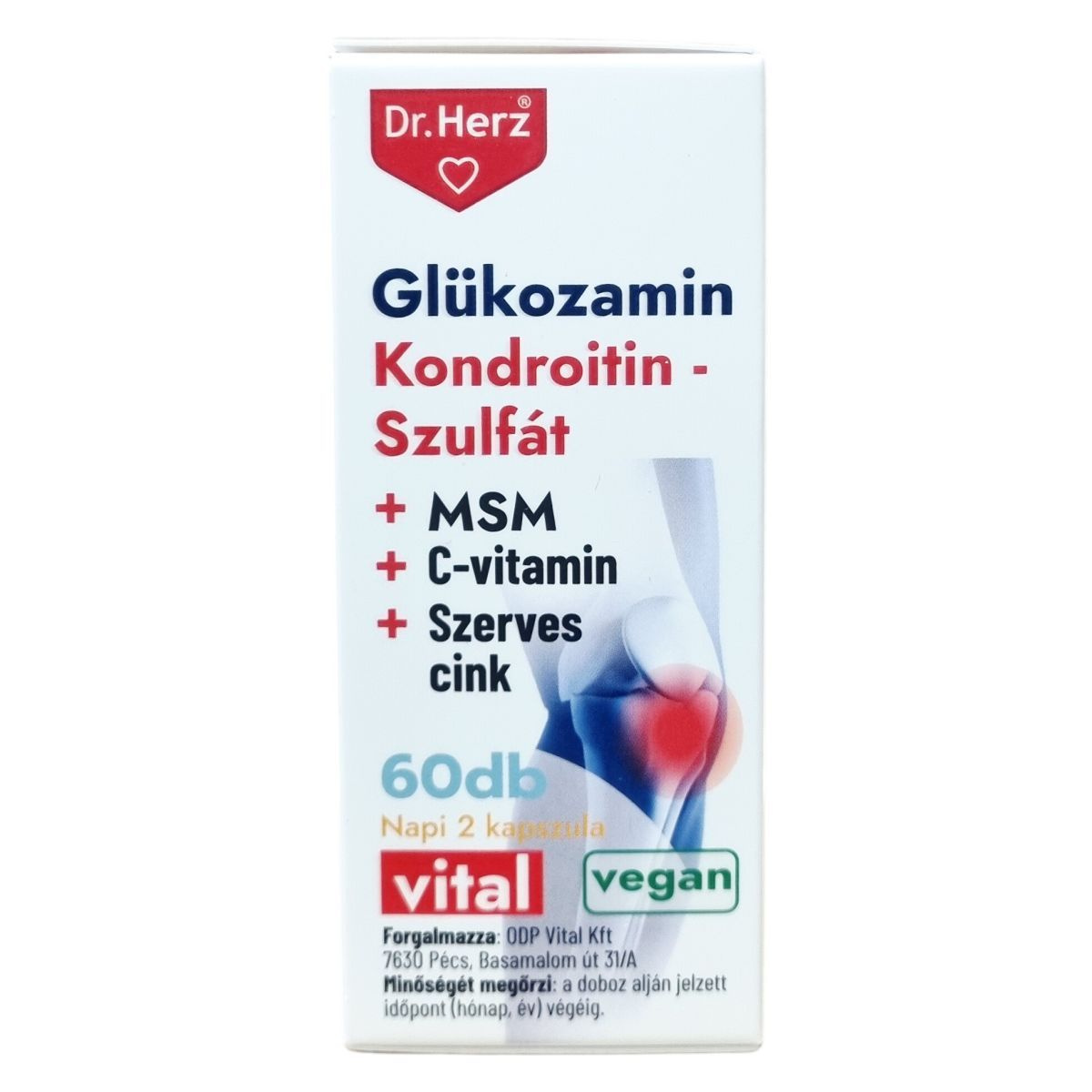 A készítmény glükozamin-szulfátot tartalmaz, amely hozzájárulhat a porcok egészségének fenntartásához. A kondroitin-szulfát segítheti az ízületek számára szükséges kenőfolyadék mennyiségét, míg az MSM támogatja az ízületi szövet rugalmasságát és az ízületek erősségét. A C-vitamin részt vehet az egészséges vérerek, csontok, porcok, bőr és fogak normál működésében, valamint a kollagénképződésben. A szerves kötésű cink fontos szerepet játszhat az immunrendszer működésében és a szervezet védekezőképességében. A tájékoztató felhívja a figyelmet arra, hogy a termék fogyasztása nem helyettesíti a kiegyensúlyozott étrendet és az egészséges életmódot, valamint hogy tengeri eredetű allergiások számára nem ajánlott. A kapszulákat javasolt napi két alkalommal, főétkezések előtt bőséges folyadékkal lenyelni.