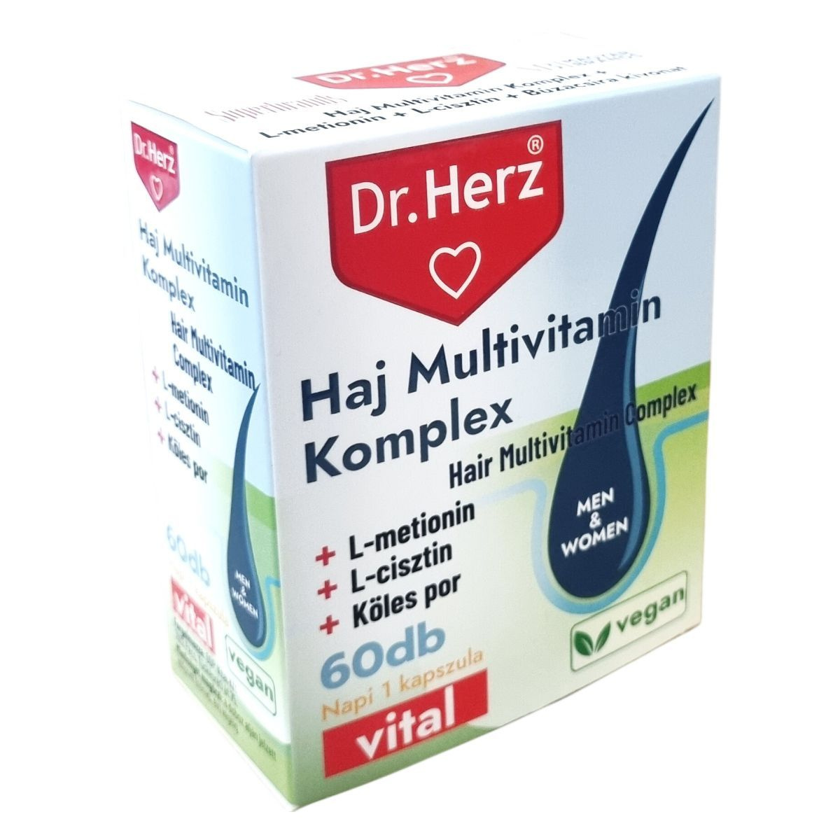 A Dr.Herz Haj Multivitamin Komplex speciális étrend-kiegészítő kapszula, amely búzacsíra kivonatot, köles port, L-cisztint, L-metionint és jól hasznosuló szerves cinket tartalmaz. A B5-vitamin részt vehet a normál energiatermelő folyamatokban, míg a B6-vitamin hozzájárulhat a normál cisztein-anyagcseréhez. A B7-vitamin a normál anyagcserében játszhat szerepet, és támogathatja a haj normál állapotának fenntartását. A cink védelmet nyújthat a sejtek oxidatív stresszel szemben, valamint hozzájárulhat a bőr, köröm és haj egészségéhez. A készítmény L-metionin és L-cisztin tartalma elősegítheti a haj vitalitását és erősítését, miközben antioxidáns hatású lehet. A kapszula napi egyszeri adagolásra ajánlott, vegán összetétele révén széles körben alkalmazható a haj ápolására és támogatására.