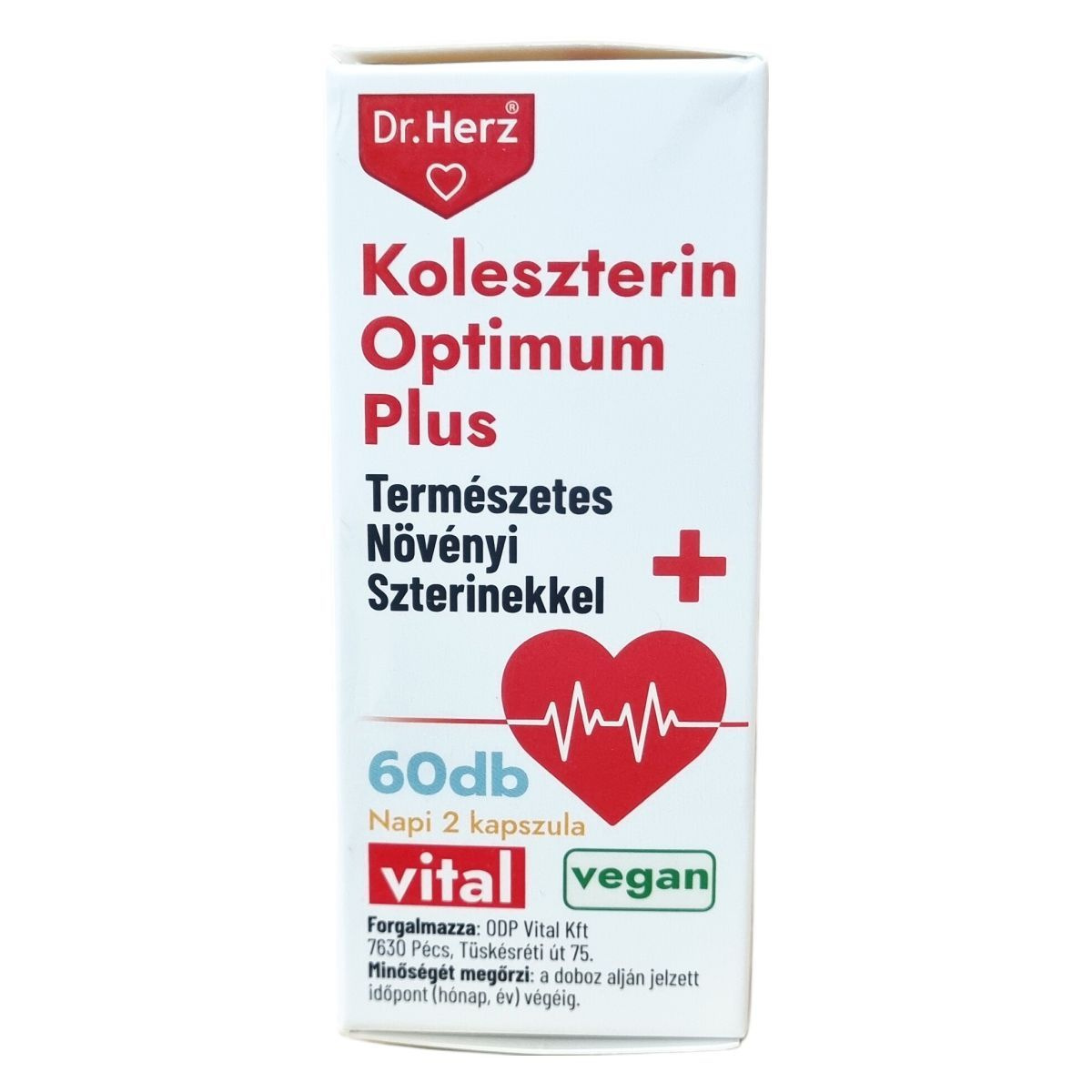 A Dr.Herz Koleszterin Optimum Plus természetes növényi szterinekkel tartalmazó kapszula 60 darabos kiszerelésben készül. A természetes növényi szterinek hozzájárulhatnak a vér normál koleszterinszintjének fenntartásához, amely fontos a szív és az érrendszer egészségének megőrzésében. A termék napi 2 kapszula fogyasztásával ajánlott, a kedvező hatás napi 800 mg növényi szterin bevitelével érhető el. A természetes összetevők között szerepelnek növényi szterinek, kukoricakeményítő mint tömegnövelő szer, mikrokristályos cellulóz csomósodást gátló anyagként, valamint vegán kapszulahéj, mely hidroxipropil-metilcellulózból áll. A készítmény nem tartalmaz állati eredetű összetevőket, ezért vegán étrendbe is beilleszthető. Fontos betartani az ajánlott adagolást, és a termék fogyasztása nem helyettesíti a kiegyensúlyozott étrendet és egészséges életmódot. Terhesség és szoptatás ideje alatt a használata nem javasolt, valamint 3 gramm feletti napi növényi szterinbevitel kerülendő. A koleszterinszint-csökkentő gyógyszeres kezelés alatt álló személyek csak orvosi felügyelettel használhatják a terméket. A készítményt gyermekektől elzárva kell tartani, és tárolása szobahőmérsékleten, fénytől és nedvességtől védett helyen ajánlott.
