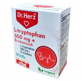 A Dr. Herz L-tryptophan 500 mg + B-vitaminok étrend-kiegészítő kapszula 60 db-os kiszerelésben kapható. Az L-tryptophan hozzájárulhat a feszültség és szorongás enyhítéséhez, valamint a pihentető alvás elősegítéséhez. A B6, B2, B1 és B12 vitaminok csökkenthetik a fáradtságot és a kifáradást, elősegíthetik a normál pszichológiai funkció fenntartását és az idegrendszer normál működését. A folsav támogathatja az immunrendszer megfelelő működését. A termék vegán étrendbe illeszthető.