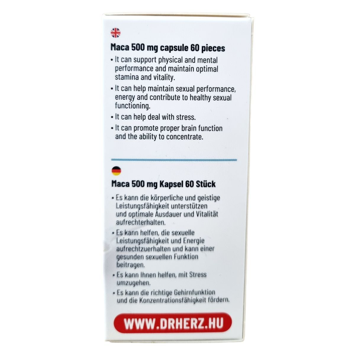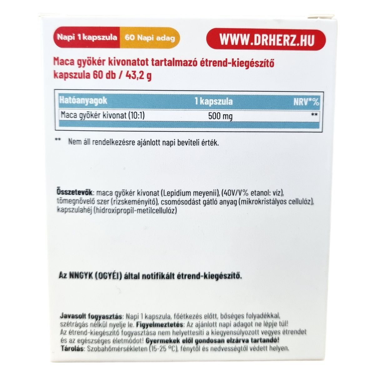 A Dr.Herz Maca kapszula 500 mg maca gyökér kivonatot tartalmaz, amely hozzájárulhat az optimális fizikai és mentális teljesítmény fenntartásához, valamint támogathatja az állóképességet és vitalitást. A termék elősegítheti az egészséges szexuális funkciókat és energiát, valamint a stressz kezelését. A maca gyökér kivonat (10:1 arányú koncentrációban) természetes módon készült, rizskeményítővel töltött kapszulahéjban található. A termék fogyasztása megfelelő lehet azok számára, akik természetes eredetű, vegán étrend-kiegészítőt keresnek az életminőség támogatásához.