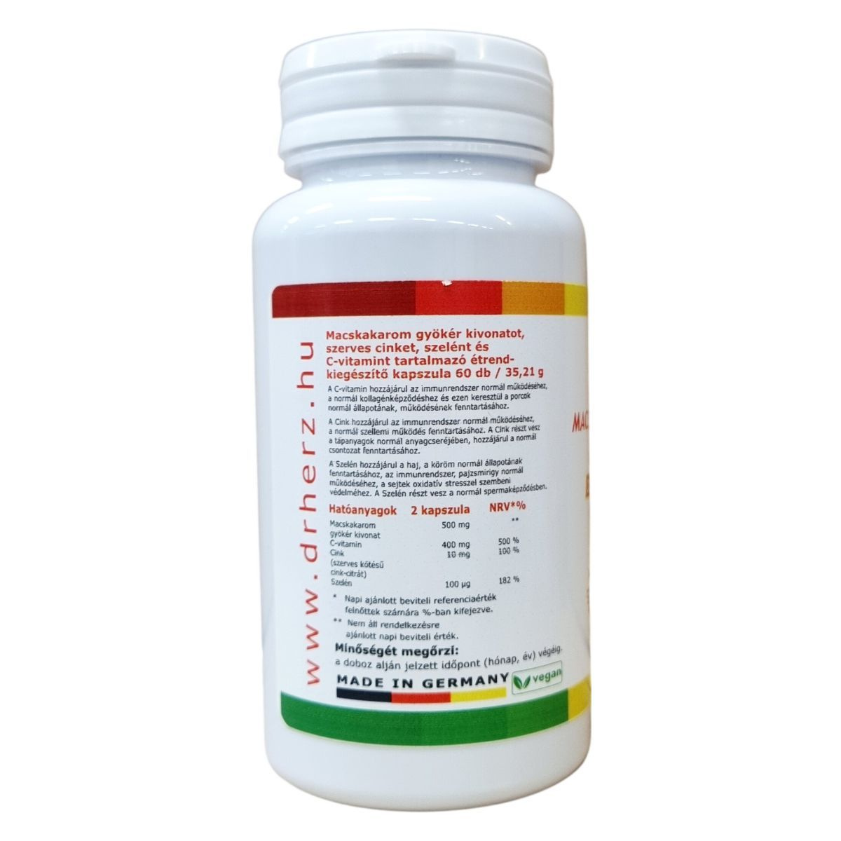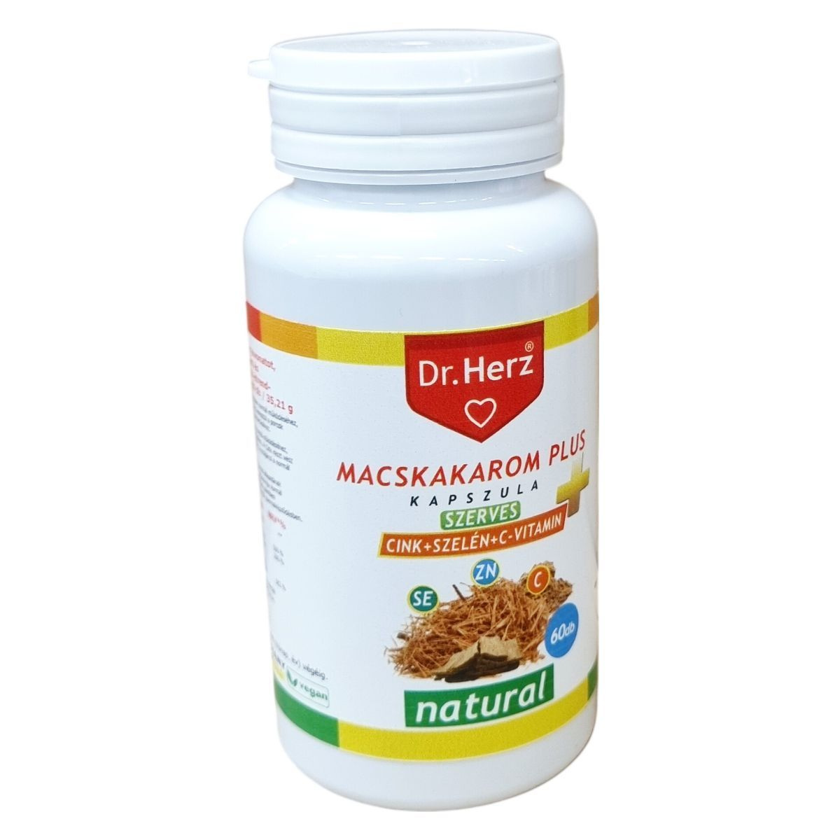 A Dr.Herz Macskakarom Plus kapszula a macskakarom gyökér kivonatán túl szerves cinket, szelént és C-vitamint tartalmaz, melyek hozzájárulhatnak az immunrendszer normál működéséhez. A C-vitamin támogatja a normál kollagénképződést és a porcok egészséges állapotát, míg a cink hozzájárulhat a szellemi működés és a csontok megőrzéséhez, valamint a tápanyagok normál anyagcseréjéhez. A szelén segítheti a haj és a köröm egészséges állapotának fenntartását, illetve részt vesz a sejtek oxidatív stressz elleni védelmében, és hozzájárulhat a pajzsmirigy normál működéséhez, továbbá a spermaképződéshez. A készítmény kapszula formájában készült, könnyen fogyasztható, javasolt napi adagja 2 kapszula, kiszerelése 60 darab, összesen 35,21 g tömegű. A termék származási helye Németország, és vegán étrendbe is beilleszthető.