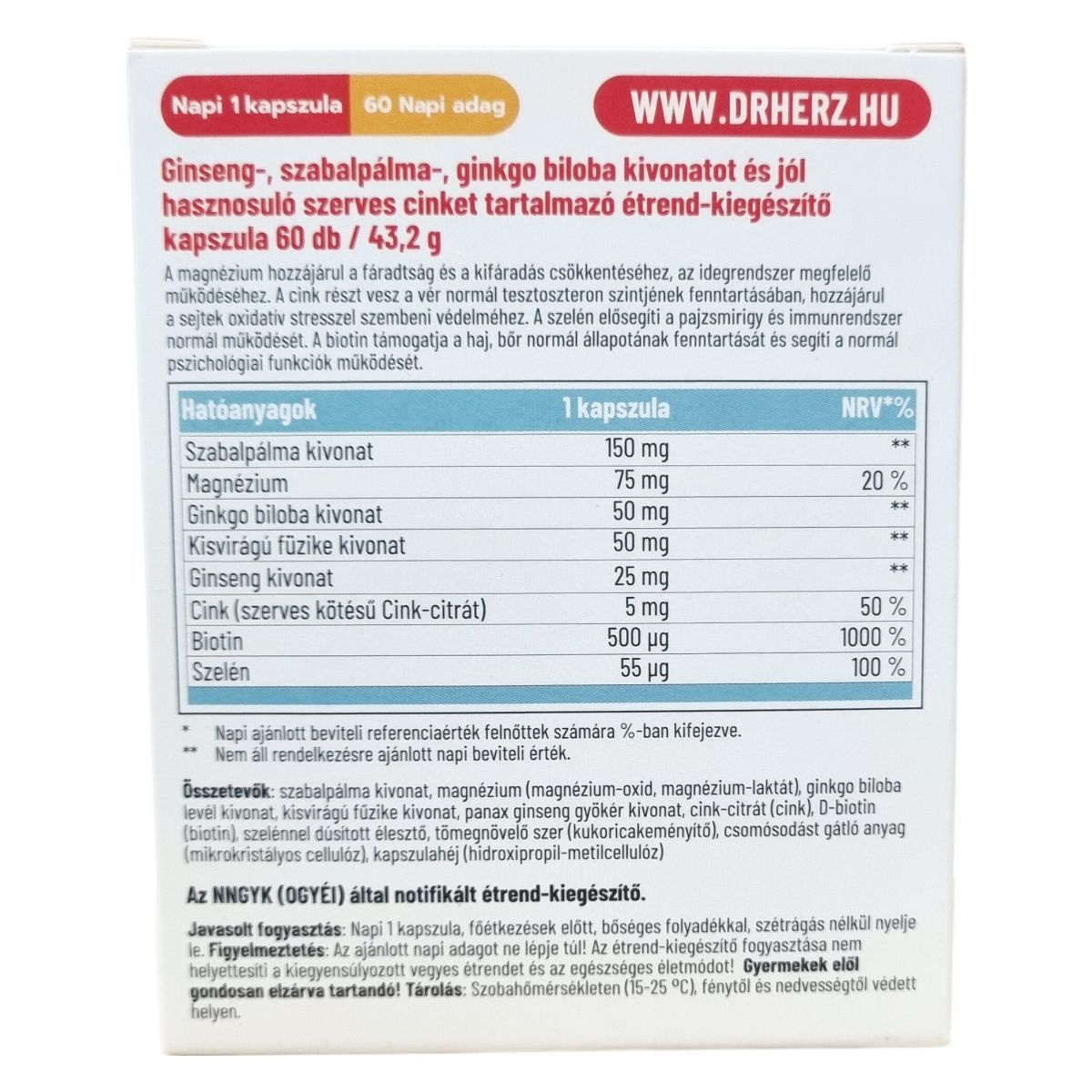 A Multivitamin Complex For Men multivitamin kapszula, amely természetes kivonatokat és ásványi anyagokat tartalmaz, többek között ginseng, szabalpálma és ginkgo biloba kivonatokat. A magnézium hozzájárul a fáradtság csökkentéséhez és az idegrendszer megfelelő működéséhez, míg a cink segítheti a vér normál tesztoszteronszintjének fenntartását és támogathatja a sejtek oxidatív stresszel szembeni védelmét. A szelén elősegítheti a pajzsmirigy és az immunrendszer normál működését. A biotin hozzájárulhat a haj és a bőr egészségéhez, valamint segítheti a pszichológiai funkciók normál működését. A termék napi egy kapszula adagolásával szedhető, és nem helyettesíti a kiegyensúlyozott étrendet és az egészséges életmódot.