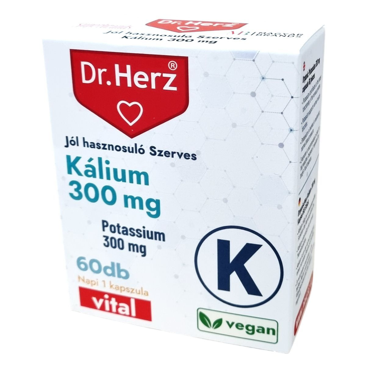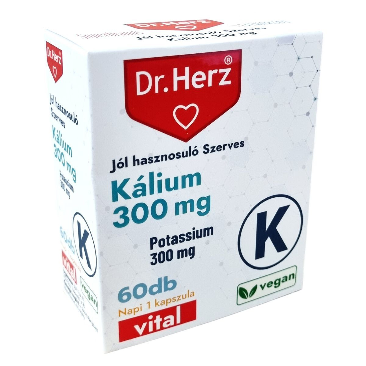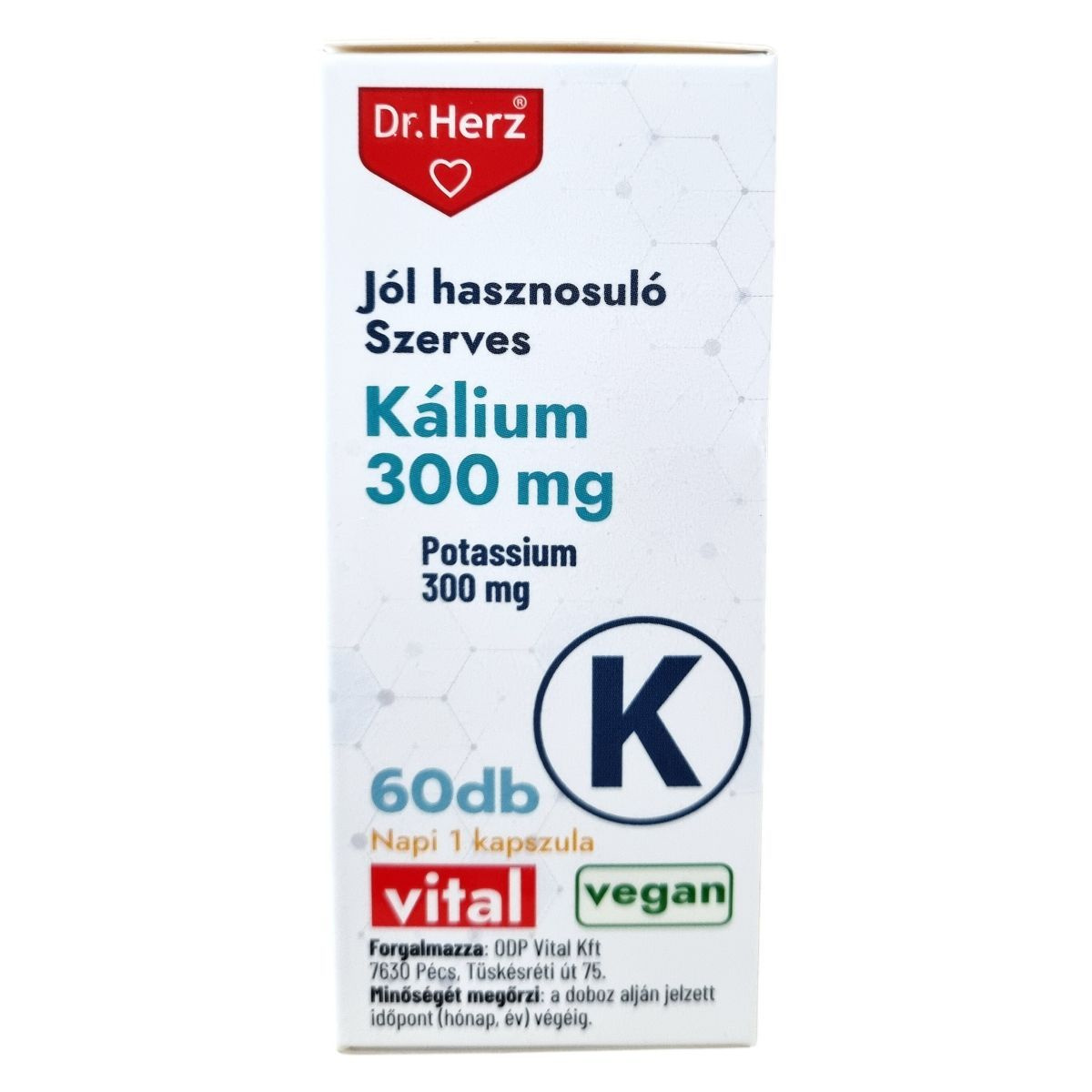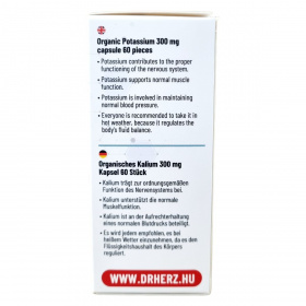 A Dr.Herz® Jól hasznosuló Szerves Kálium 300 mg kapszula szerves kötésű tri-kálium-citrátot tartalmaz, amely káliumforrásként szolgál. A kálium szerepet játszhat az idegrendszer megfelelő működésében, a normál izomműködés támogatásában és a vérnyomás fenntartásában. A termék ajánlott a meleg időszakokban, mivel segítheti a test folyadékháztartásának szabályozását. Napi 1 kapszula fogyasztása javasolt bőséges folyadékkal, főétkezés előtt. A termék vegán étrendhez is megfelelő, és OGYÉI által notifikált étrend-kiegészítőként forgalmazzák.