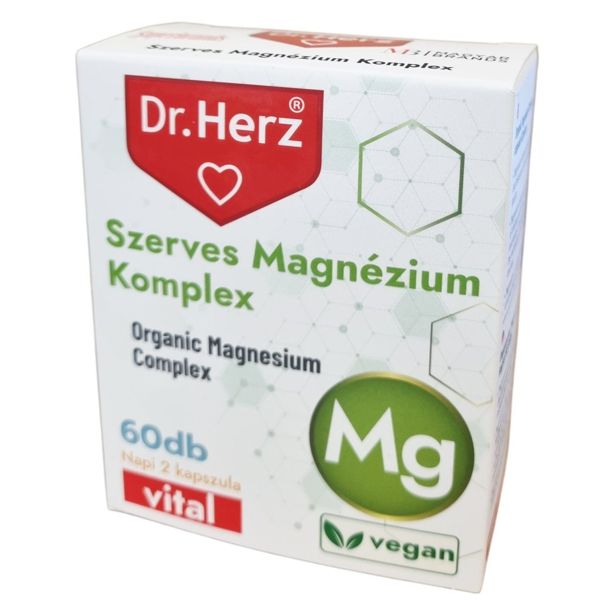 A Dr.Herz® Szerves Magnézium Komplex kapszula jól hasznosuló szerves magnézium forrásokat tartalmaz, mint a magnézium-citrát, magnézium-biszglicinát és magnézium-malát. A magnézium hozzájárulhat az idegrendszer megfelelő működéséhez, a normál izomműködés fenntartásához, és részt vehet a pszichológiai funkciók fenntartásában. Emellett támogathatja a fogazat és a csontok egészségének megőrzését, csökkentheti a fáradtságot és kimerültséget, illetve részt vehet az energiatermelő anyagcsere-folyamatokban. A készítmény vegán étrendet követők számára is alkalmas, és kapszula formában, napi két alkalommal ajánlott fogyasztani főétkezések előtt, bőséges folyadékkal. Az étrend-kiegészítő nem helyettesíti a kiegyensúlyozott táplálkozást és egészséges életmódot, és gyermekek elől gondosan el kell zárni.