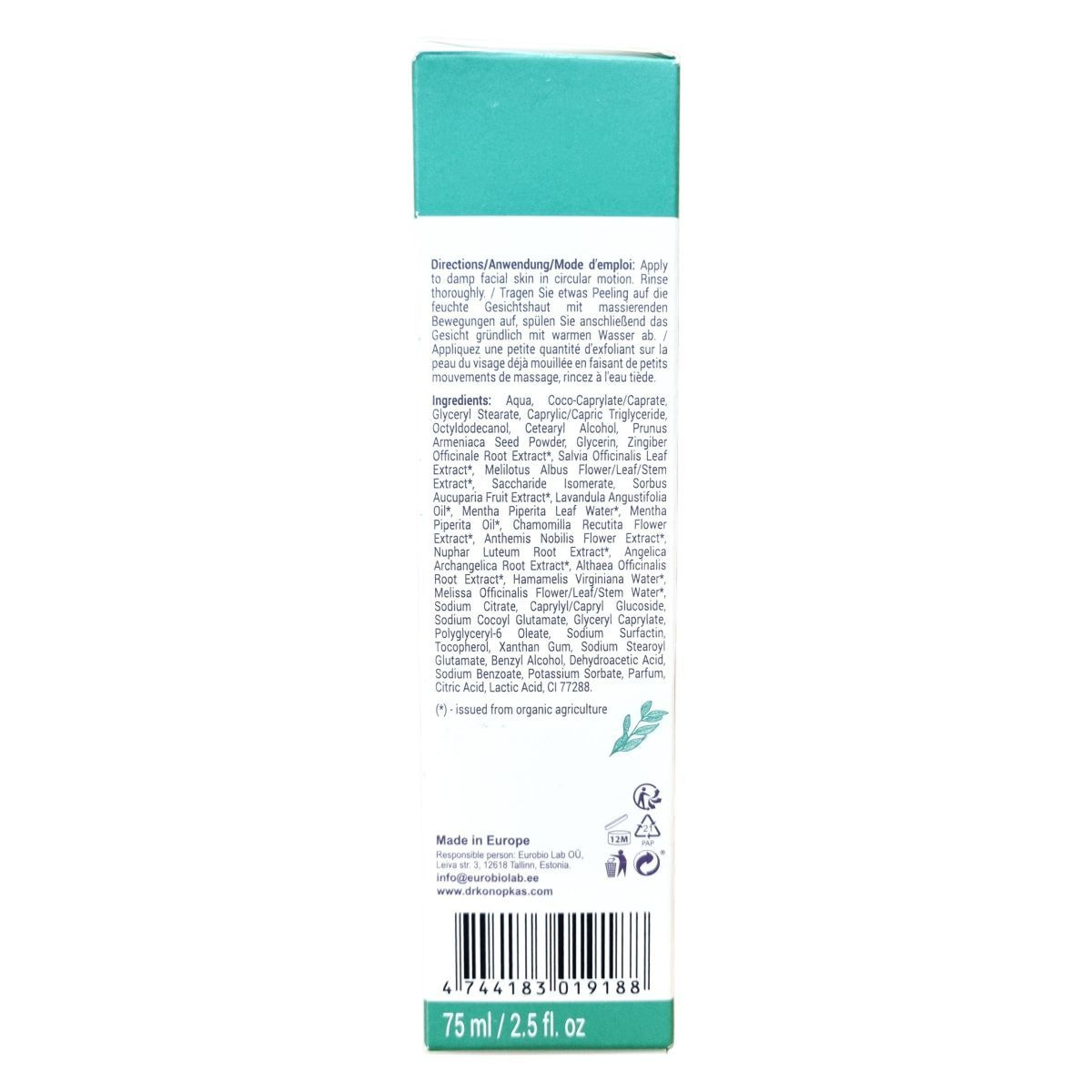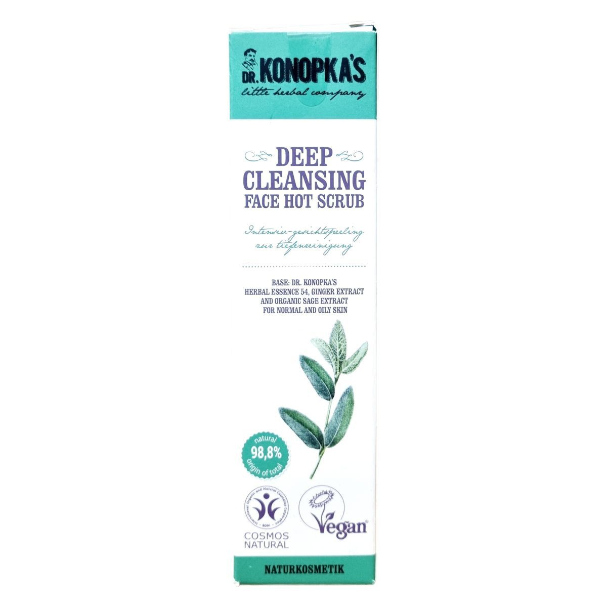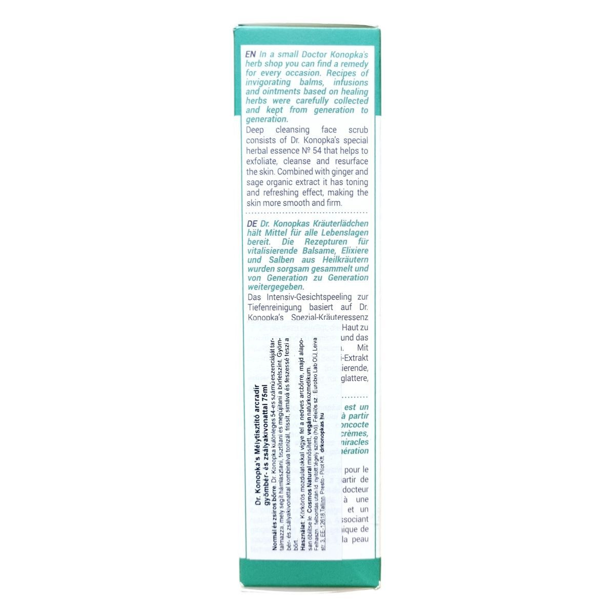 A Dr. Konopka's termékek egy kis hagyományos gyógynövényboltból származnak, ahol évszázadokon át gyűjtött növényi alapú, vitalizáló recepteket őriznek. Ez az intenzív arcradír a különleges 54-es növényi esszencián alapul, amely segíti a bőr hámlasztását, mélytisztítását és megújítását. A gyömbér és a szerves zsályakivonat együttesen tonizáló és frissítő hatású, elősegítve a bőr simaságát és feszességét. Természetes összetevőinek aránya 98,8%, normál és zsíros bőrre ajánlott. A termék vegán és természetes kozmetikumként minősített, és Európában készült.