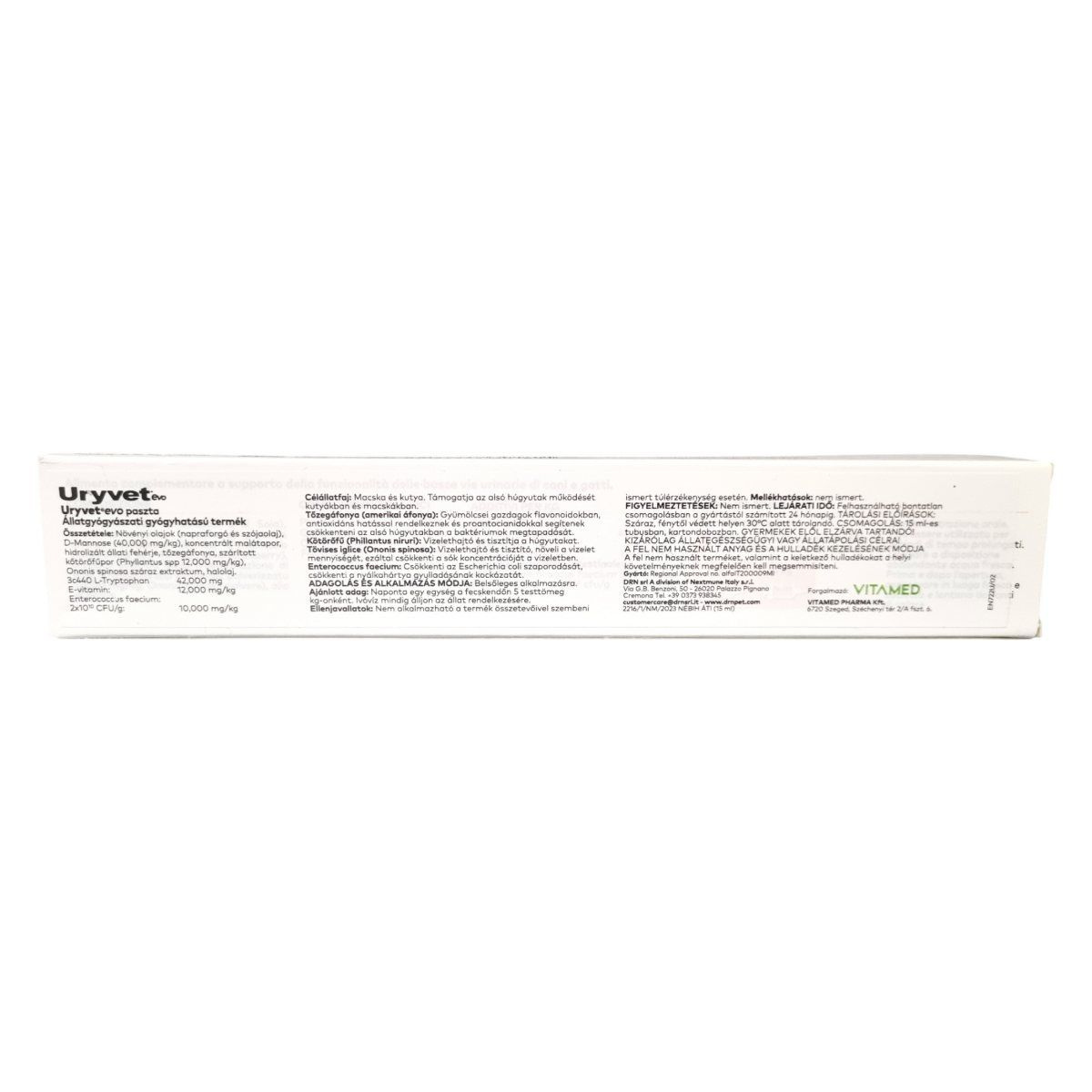 Az Uryvet Pasta evo olyan állatgyógyászati gyógyhatású készítmény, amely természetes összetevői révén támogathatja a kutyák és macskák alsó húgyúti rendszerének egészségét. A D-mannóz és az Enterococcus faecium hozzájárulhat a húgyutak mikrobiológiai egyensúlyának fenntartásához, a triptofán segítheti a stressz csökkentését, míg a C-vitamin antioxidánsként támogathatja a szervezet védekezőképességét. A paszta formátum könnyű adagolást biztosít, így ideális választás a húgyúti komfort megőrzésére hajlamos állatok számára.