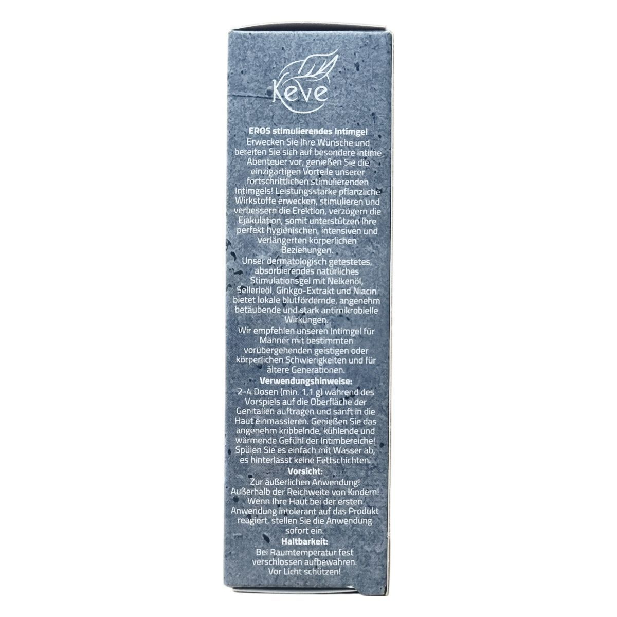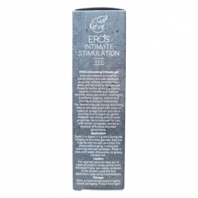 Az EROS stimuláló intimgél természetes, növényi alapú összetevőkkel készült és kifejezetten férfiak számára ajánlott a testi intimitás fokozására. Hatásmechanizmusa a vérbőség elősegítése, az erekció támogatása és az ejakuláció késleltetése, így hosszabb és intenzívebb együttlétet tesz lehetővé. A gélt bőrgyógyászatilag tesztelték, aktív összetevői – mint a szegfűszegolaj, zellerolaj, ginkgo kivonat és niacin – kellemes bizsergő, hűsítő, melegítő érzést keltenek az intim területeken, miközben erős fertőtlenítő hatással is bírnak. Használata egyszerű, gyorsan beszívódik és nem hagy zsíros érzetet. Ajánlott olyan férfiaknak, akik átmeneti mentális vagy fizikai nehézségekkel, illetve az életkorral járó intim problémákkal küzdenek. A termék csak külső használatra alkalmas, és használat előtt figyelmesen el kell olvasni a figyelmeztetéseket.