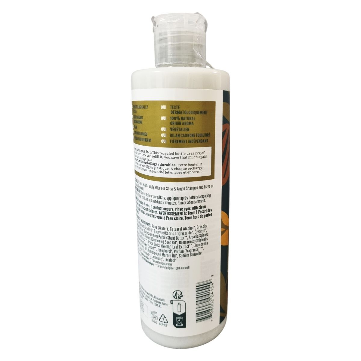 Víz (Aqua), cetearil-alkohol, repcemagolaj (Brassica Campestris Seed Oil), kapril/kaprin trigliceridek, glicerin, kationos hajkondicionáló összetevő (Cetrimonium Chloride), shea vaj (Butyrospermum Parkii Butter), argánolaj (Argania Spinosa Kernel Oil), napraforgómag-olaj (Helianthus Annuus Seed Oil), rozmaring levél kivonat (Rosmarinus Officinalis Leaf Extract), csalánlevél kivonat (Urtica Dioica Leaf Extract), kamillavirág kivonat (Chamomilla Recutita Flower Extract), E-vitamin (Tocopherol), illatanyag (Parfum), tagetes virágolaj (Tagetes Minuta Flower Oil), pálmarózsa olaj (Cymbopogon Martini Oil), nátrium-benzoát, citromsav (Citric Acid), benzil-szalicilát, limonén, linalool