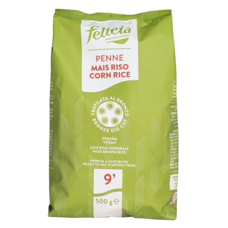 Gluténmentes Felicia bio kukorica-rizs penne tészta.