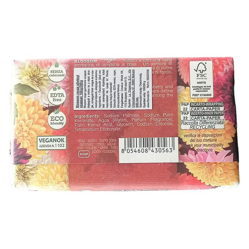 Blossom rouge 200g gyümölcsös szappan, illatjegyét a málna és a ribizli alkotják, szívjegyét fehér virágok és a cseresznye képezik, alapjegye a pézsma.