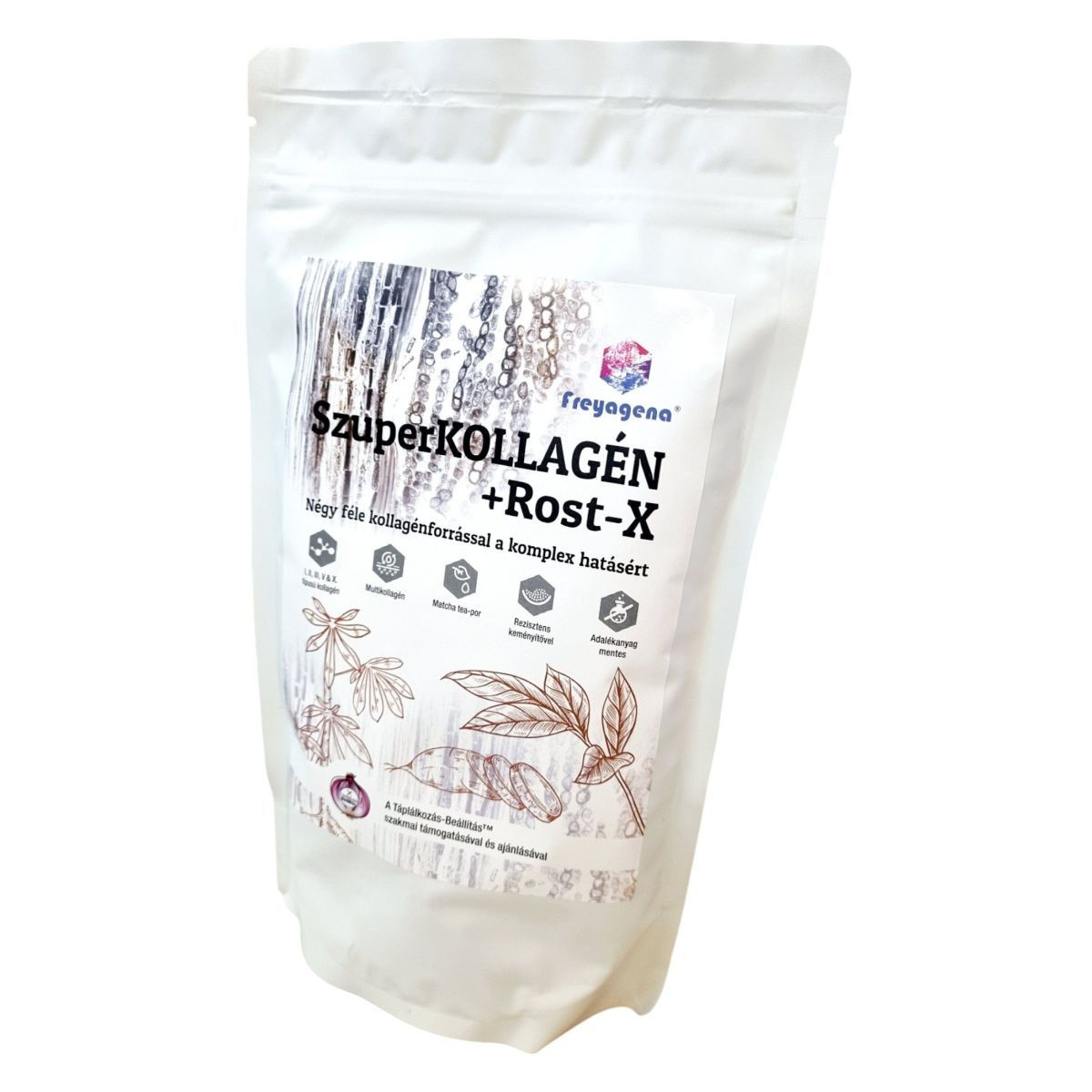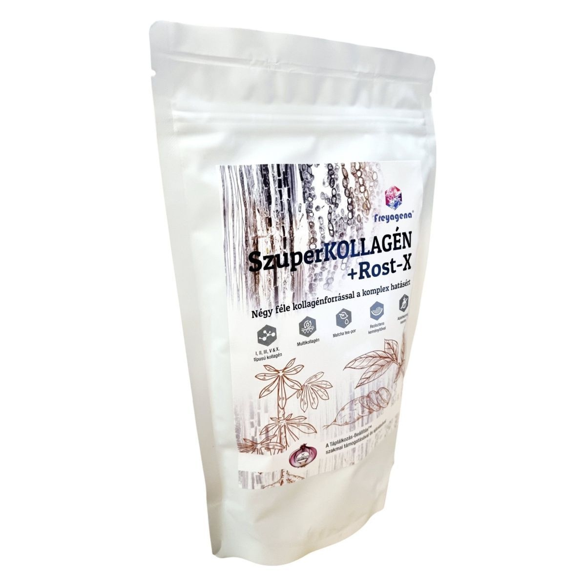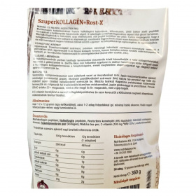 A SzuperKOLLAGÉN+Rost-X egy komplex étrend-kiegészítő, amely négyféle kollagénforrást tartalmaz: marhakollagén, halkollagén, csirkeporc-kivonat és tojáshéjmembrán. A termék célja, hogy támogassa a kollagénpótlást és a kötőszövetek egészségét. A halkollagén előemésztett formában van jelen, hogy maximalizálja a hasznosulást, míg a csirkeporc-kivonat természetes hialuronsavat és kondroitin-szulfátot is tartalmazhat. A matcha tea-por magas ORAC-értékkel rendelkezik, ami antioxidáns hatású lehet. A termék adalékanyag-mentes, és a Táplálkozás-Beállítás™ szakmai támogatásával készült.