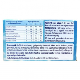 A GALLMET® IMMUNE (ANTIBAC) étrendkiegészítő kapszula természetes összetevőkkel készülhet, mint például a liofilizált marha epe, fekete bodza kivonat, kurkuma kivonat, orvosi pemetefű kivonat, keserű andrográfisz kivonat, fokhagyma kivonat és fekete bors kivonat. Ezek az összetevők hozzájárulhatnak az immunrendszer támogatásához és az emésztés javításához, valamint segíthetnek a káros baktériumok és mikroorganizmusok elleni védekezésben. A termék használata előtt ajánlott szakemberrel konzultálni, különösen, ha más epére ható készítményeket is szed, vagy véralvadás-gátló gyógyszert használ. A készítmény nem helyettesíti a kiegyensúlyozott, vegyes étrendet és az egészséges életmódot.