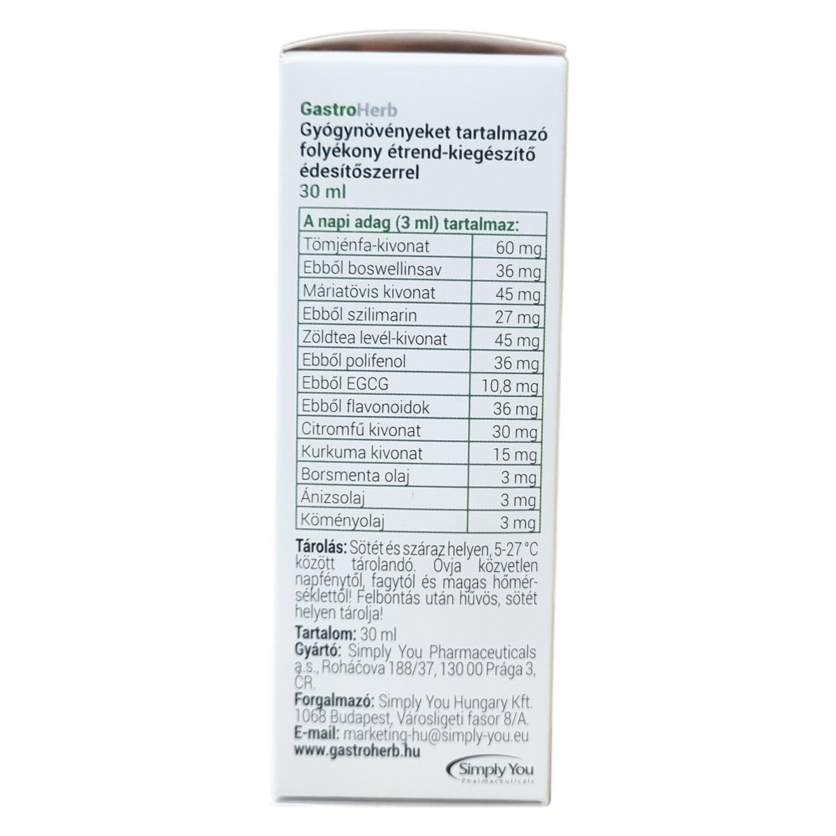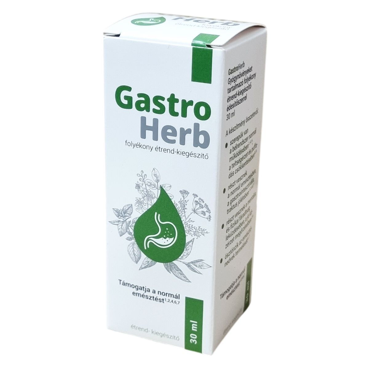 A GastroHerb egy gyógynövényeket tartalmazó folyékony étrend-kiegészítő, amely különféle növényi kivonatokból és esszenciális olajokból áll. Összetevői között szerepelnek például tömjénfa gyanta-kivonat, máriatövis mag-kivonat, zöldtea levél-kivonat, citromfű levél-kivonat, kurkuma gyökér-kivonat, illetve borsmenta, ánizs és kömény olajok. Ezek az összetevők szerepet játszhatnak a bélrendszer normál működésében, a teltségérzet és puffadás csökkentésében, valamint a gasztrointesztinális traktus jólétének támogatásában. Ezen felül hozzájárulhatnak a mentális és fizikai fáradtság leküzdésében és a jó közérzet megőrzésében, továbbá ösztönözhetik az emésztőnedvek termelését. A termék édesítőszerrel készül, és 30 ml kiszerelésű, amely napi adagja 3 ml. A készítmény használata során figyelembe kell venni az ajánlott adagolást és a figyelmeztetéseket, valamint a tárolási útmutatókat is. A GastroHerb fogyasztása a kiegyensúlyozott étrend és egészséges életmód kiegészítését szolgálja.